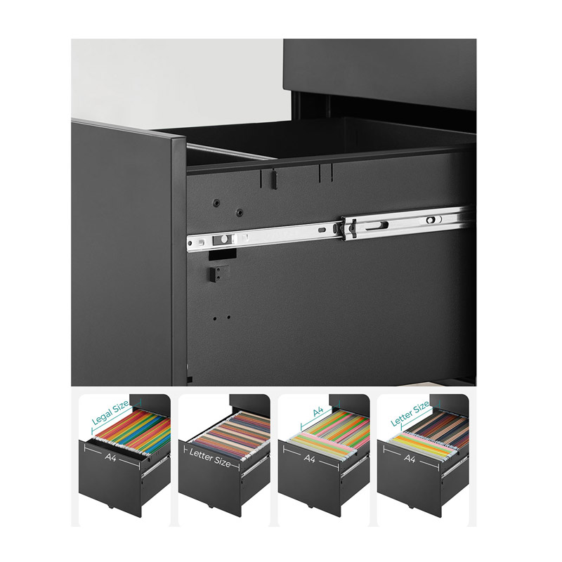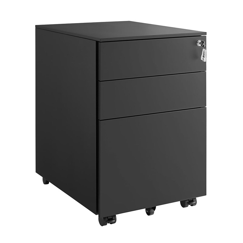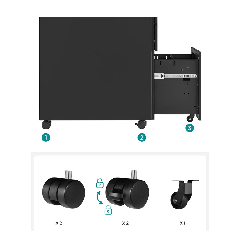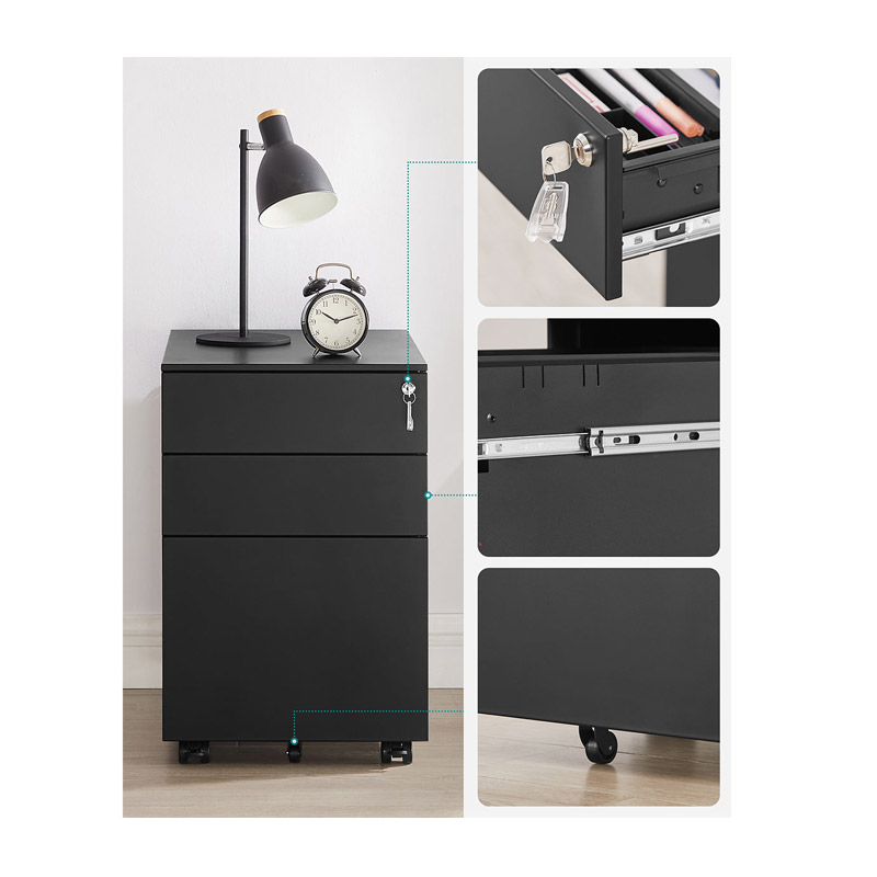 Η συρταριέρα γραφείου, από την εταιρία Songmics, είναι κατασκευασμένη από ατσάλι, για μέγιστη αντοχή. Διαθέτει 3 συρτάρια διαφορετικών μεγεθών, τα οποία κλειδώνουν για πιο ασφαλή φύλαξη. Το κάτω συρτάρι είναι κατάλληλο για φακέλους αρχειοθέτησης. Είναι εξοπλισμένη με 5 τροχούς ώστε να μπορεί να μετακινηθεί εύκολα οπουδήποτε.