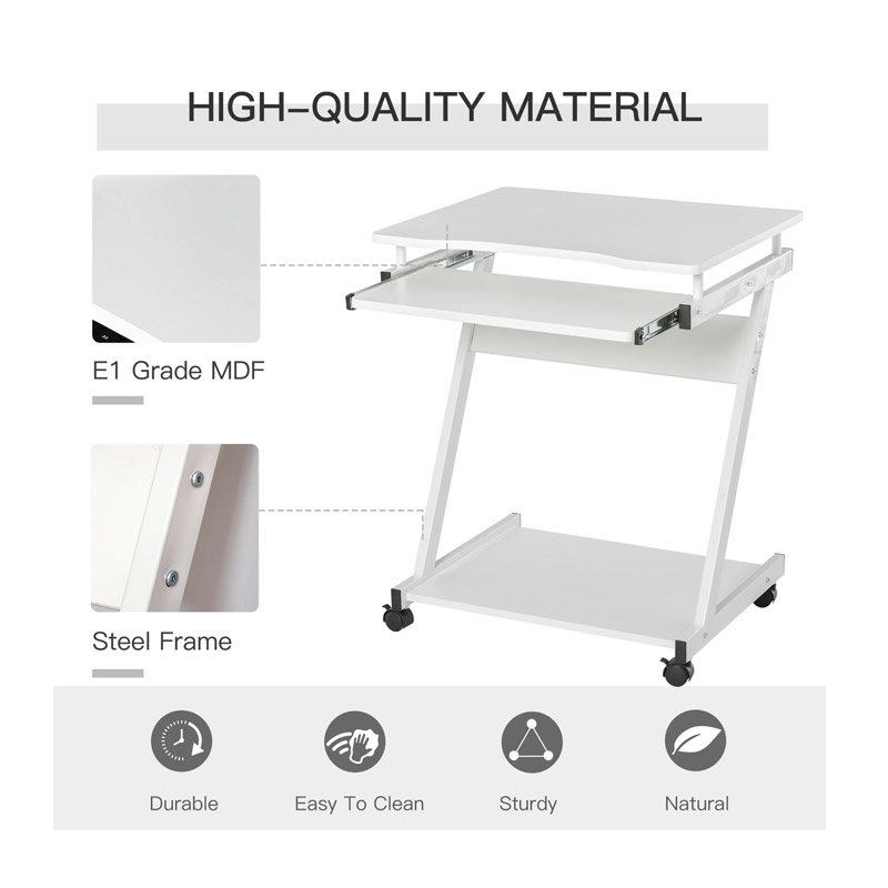 Το γραφείο υπολογιστή, από την εταιρία HOMCOM, είναι κατασκευασμένο από μέταλλο και μοριοσανίδα Ε1, είναι ανθεκτικό και εύκολο στον καθαρισμό. Χάρη στο μικρό του μέγεθος μπορείτε να το χρησιμοποιήσετε τόσο στο γραφείο όσο και στο σπίτι. Διαθέτει αφαιρούμενη θέση για το πληκτρολόγιο και ένα κάτω ράφι για αποθηκευτικό χώρο. Με 4 τροχούς (όλοι με φρένα) και χάρη στο μινιμαλιστικό του στυλ ταιριάζει απόλυτα με τα έπιπλα του σπιτιού ή του γραφείου σας.