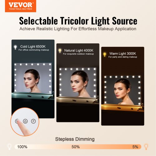 Ανακαλύψτε την πραγματική φωτεινότητα με τον καθρέφτη ματαιοδοξίας VEVOR Hollywood. Σχεδιασμένος για να προσφέρει άπειρη ρύθμιση φωτεινότητας, αυτός ο καθρέφτης είναι ιδανικός για κάθε σενάριο χρήσης.
