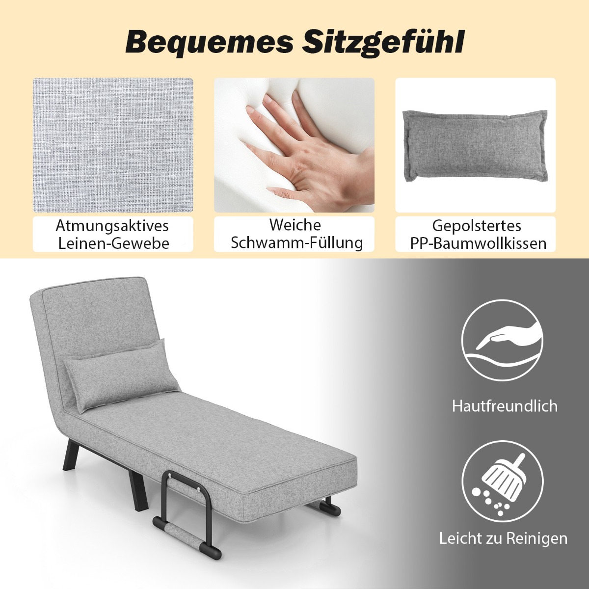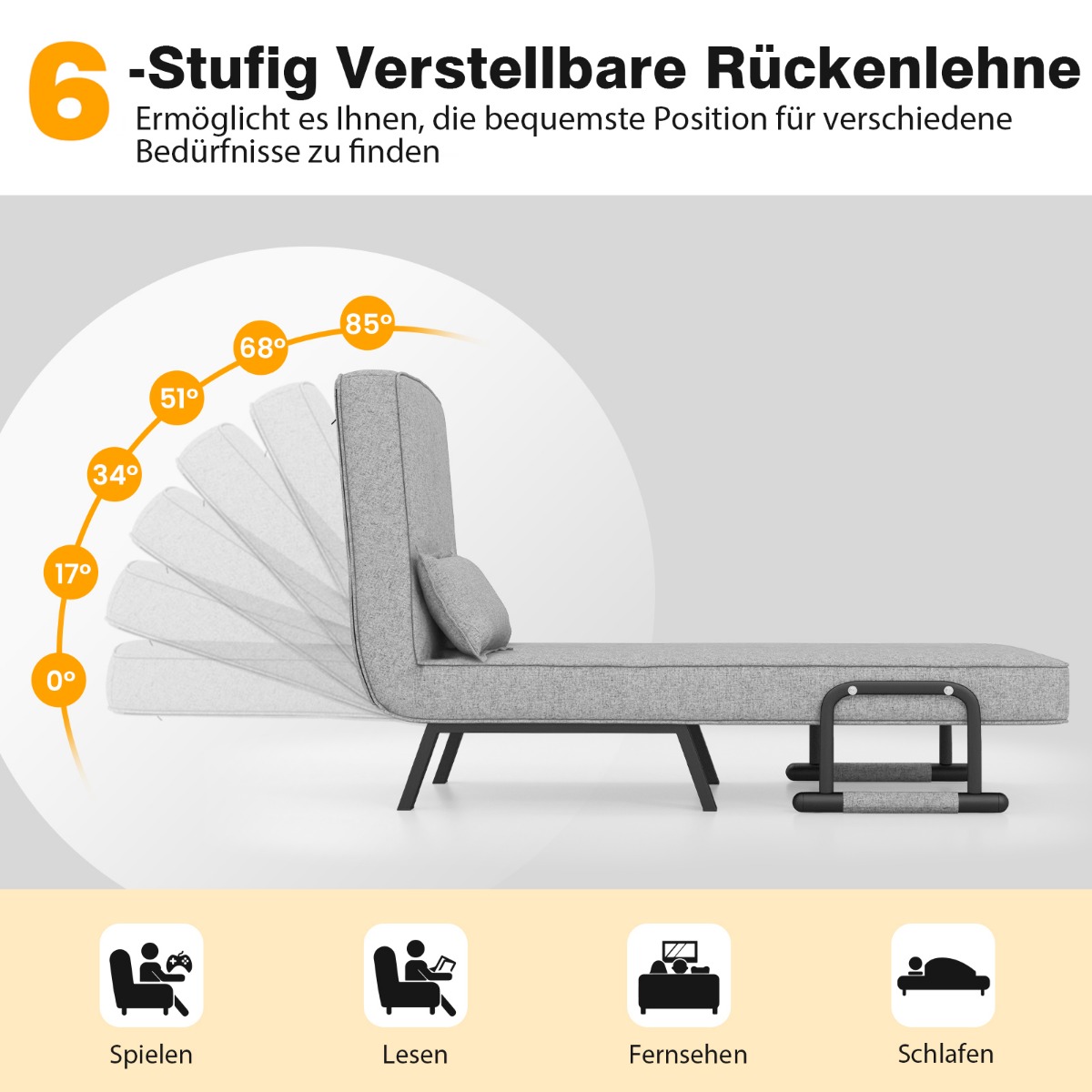 Αυτή η πολυθρόνα ύπνου είναι η ιδανική επιλογή για εσάς ή την οικογένειά σας. Μπορεί να χρησιμοποιηθεί ως κρεβάτι, καναπές-πολυθρόνα και ξαπλώστρα, καλύπτοντας όλες τις ανάγκες σας για κάθισμα ή ύπνο. Το κάθισμα είναι κατασκευασμένο από υψηλής ποιότητας λινό ύφασμα και ελαστικό σφουγγάρι για μια άνετη εμπειρία καθίσματος. Επιπλέον, το μαλακό μαξιλάρι προσφέρει περισσότερη άνεση. Μπορείτε επίσης να ακουμπήσετε τα χέρια σας στα μπράτσα για χαλάρωση. Επιπλέον, το αφαιρούμενο κάλυμμα του μαξιλαριού είναι εύκολο να καθαριστεί. Εκτός από αυτά, ο καναπές-κρεβάτι υποστηρίζεται από μεταλλικά πόδια, τα οποία είναι αρκετά ισχυρά για να αντέχουν υψηλή φέρουσα ικανότητα. Επιπλέον, τα αναδιπλούμενα, κρυφά πόδια μπορούν να αποθηκευτούν στην πλάτη όταν δεν χρησιμοποιούνται.