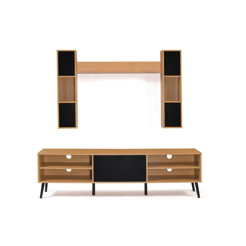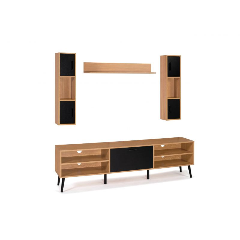 Η σύνθεση σαλονιού, από την εταιρία Idomya, έχει μοντέρνο και βιομηχανικό στυλ. Αποτελείται από ένα έπιπλο τηλεόρασης με αποθηκευτικούς χώρους και έξι οπές εισόδου καλωδίων, δύο κάθετες ραφιέρες και ένα οριζόντιο ράφι. Είναι κατασκευασμένη από μοριοσανίδες πάχους 15 mm.