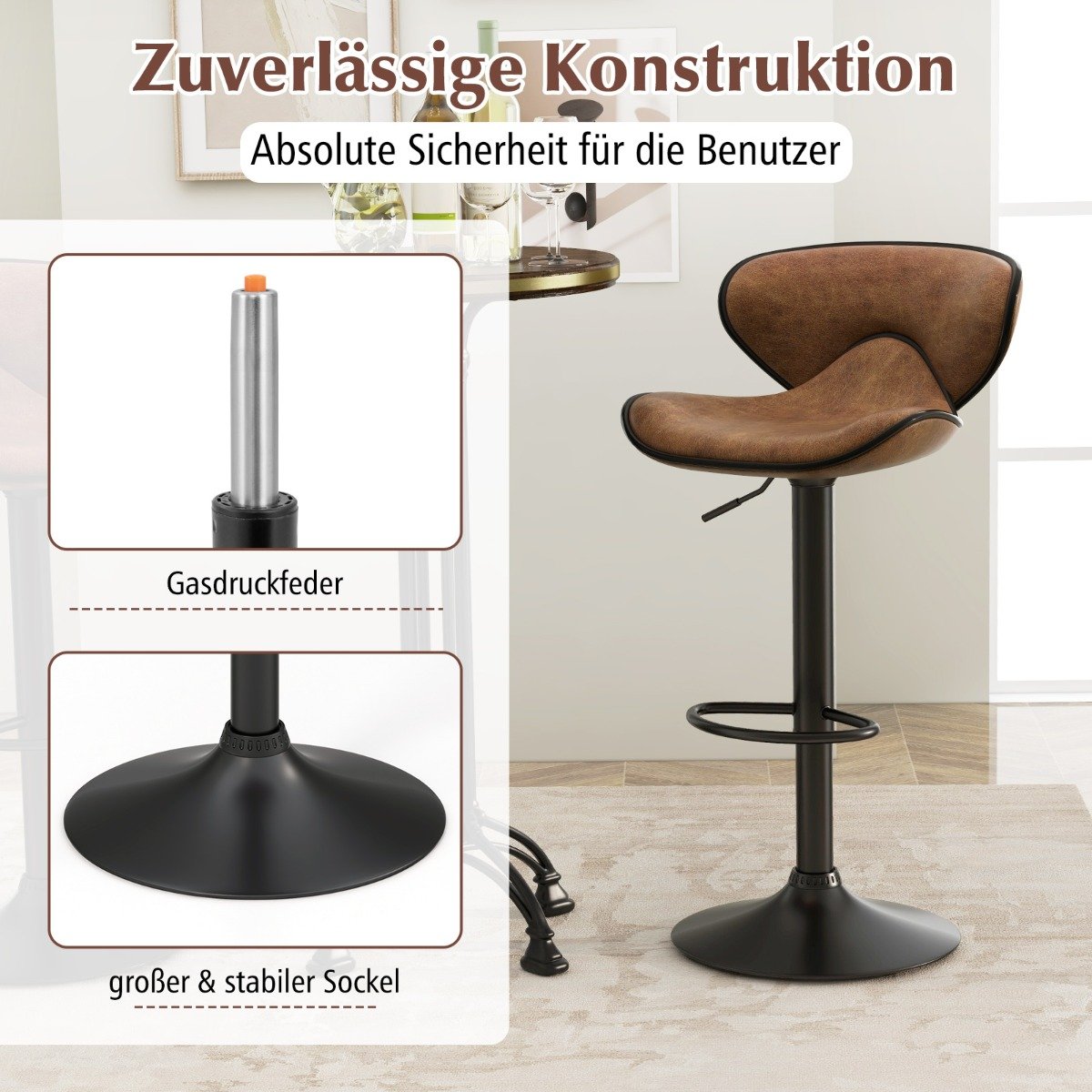 - Αξιόπιστη κατασκευή: Ο σκελετός του περιστρεφόμενου σκαμπό κουζίνας είναι κατασκευασμένος από ανθεκτικό μέταλλο για αντοχή. Ο κύλινδρος ανύψωσης αερίου εξασφαλίζει απόλυτη ασφάλεια. Επιπλέον, ο αντιολισθητικός δακτύλιος και το μεγάλο, σταθερό πόδι ενισχύουν τη σταθερότητα του σκαμπό.