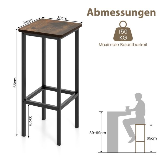 Κάθε σκαμπό διαθέτει τετράγωνο κάθισμα και υποπόδιο ύψους 22 cm, που προσφέρουν μέγιστη άνεση καθώς χαλαρώνετε με το αγαπημένο σας ποτό.Είναι εξαιρετικά σταθερά και μπορούν να αντέξουν βάρος έως και 150 κιλά. Απολαύστε τον κομψό βιομηχανικό σχεδιασμό που προσδίδει μια σύγχρονη πινελιά στον χώρο σας.