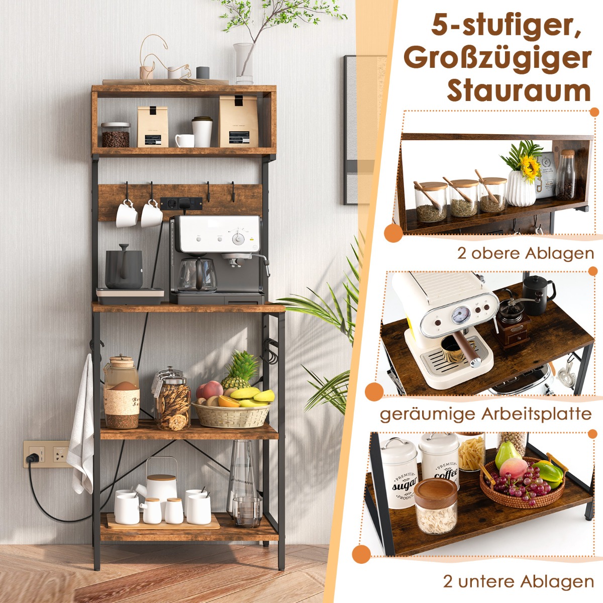 Ανακαλύψτε το πολυχρηστικό ράφι κουζίνας που σας προσφέρει άπλετο χώρο για να κρατήσετε την κουζίνα σας καθαρή και οργανωμένη. Με δύο άνω ράφια, μια ευρύχωρη επιφάνεια εργασίας και δύο κάτω ράφια, κάθε αντικείμενο βρίσκει τη θέση του. Επιπλέον, διαθέτει δύο ενσωματωμένες πρίζες AC για εύκολη φόρτιση των συσκευών σας, ενώ ο ενσωματωμένος διακόπτης εξασφαλίζει ασφαλή χρήση.