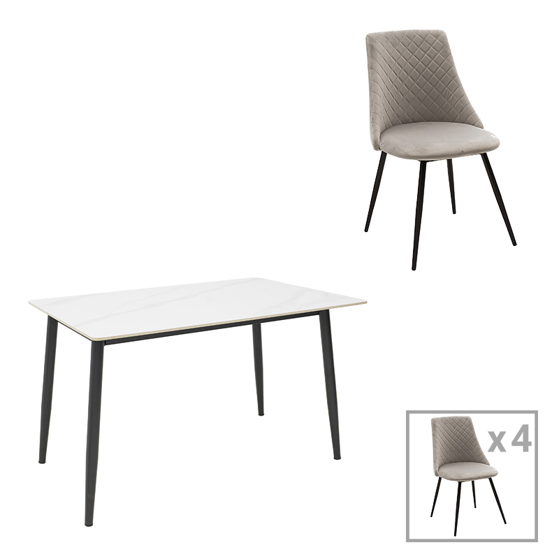 Τραπεζαρία Gustas-Giselle pakoworld σετ 5τεμ λευκό μαρμάρου-γκρι βελούδο 120x80x76εκ