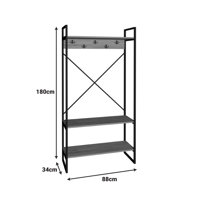 Σχεδιασμένο για να καλύπτει όλες τις καθημερινές σας ανάγκες, το έπιπλο αυτό προσφέρει μια ολοκληρωμένη λύση αποθήκευσης. Κρεμάστε άνετα τα παλτό, τα κασκόλ και τις τσάντες σας στους ενσωματωμένους γάντζους, τοποθετήστε τα παπούτσια σας τακτοποιημένα στο κάτω ράφι και χρησιμοποιήστε τα πάνω ράφια για να προσθέσετε την προσωπική σας πινελιά με διακοσμητικά αντικείμενα ή βιβλία.