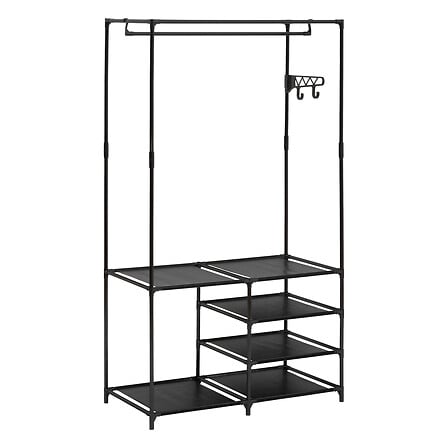 Η Intissa είναι μια ανθεκτική κρεμάστρα ρούχων με ενσωματωμένα ράφια, ιδανική για αποθήκευση και οργάνωση ρούχων, παπουτσιών και αξεσουάρ. Ο μεταλλικός & πλαστικός σκελετός προσφέρει σταθερότητα, ενώ ο κομψός μαύρος σχεδιασμός ταιριάζει σε κάθε χώρο.
