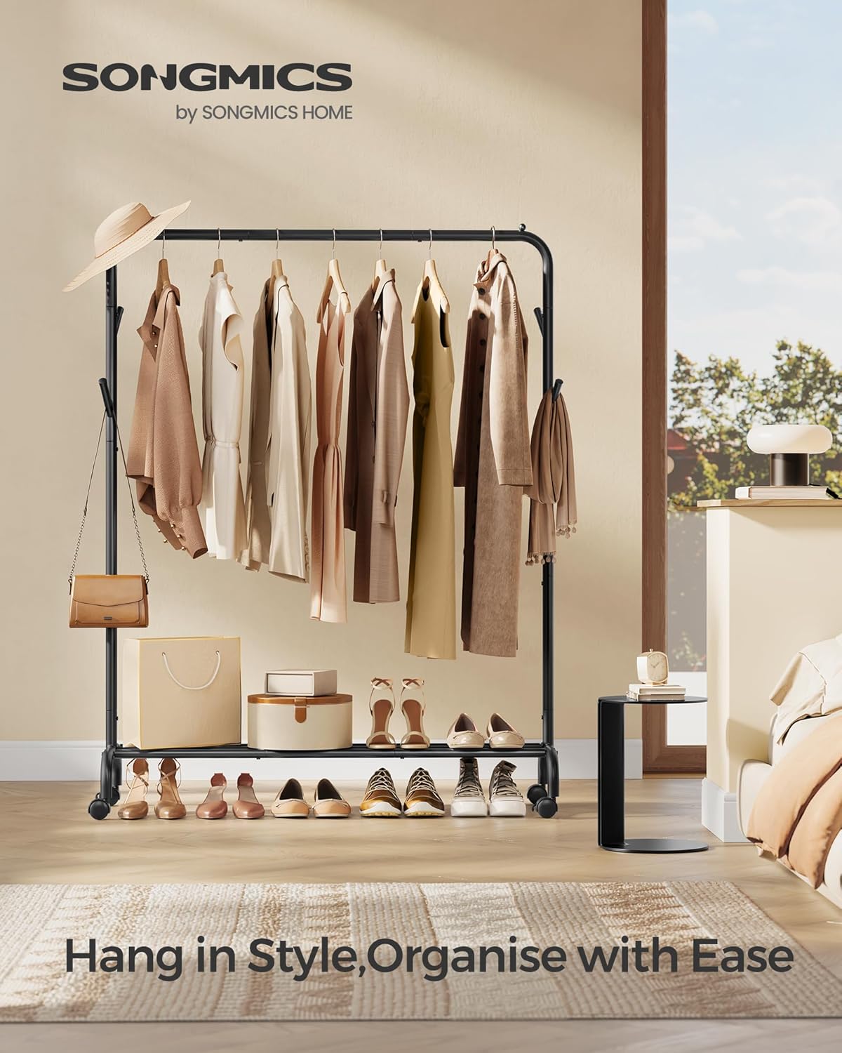 Ανθεκτική και λειτουργική ραγα ρούχων από την SONGMICS, σχεδιασμένη για να οργανώνει τα ρούχα, τα παπούτσια και τα αξεσουάρ σας σε έναν μόνο χώρο. Ιδανική για κρεβατοκάμαρες, εισόδους, σαλόνια ή ακόμα και επαγγελματικούς χώρους. Με πρακτική ρόδα για εύκολη μετακίνηση και ράφι βάσης για κουτιά ή παπούτσια.