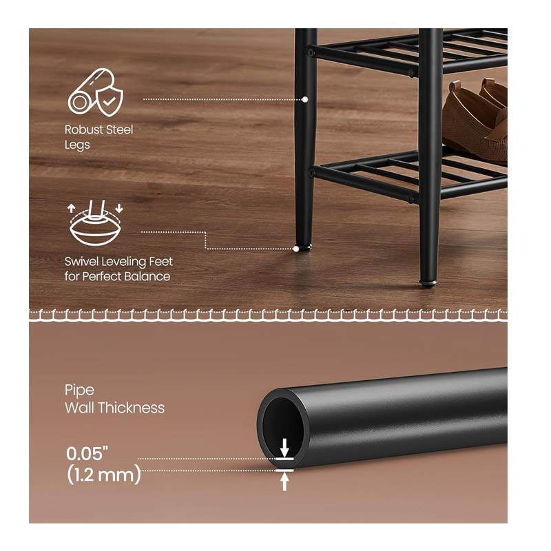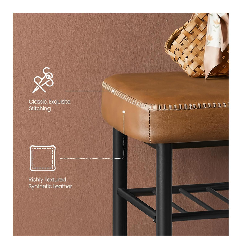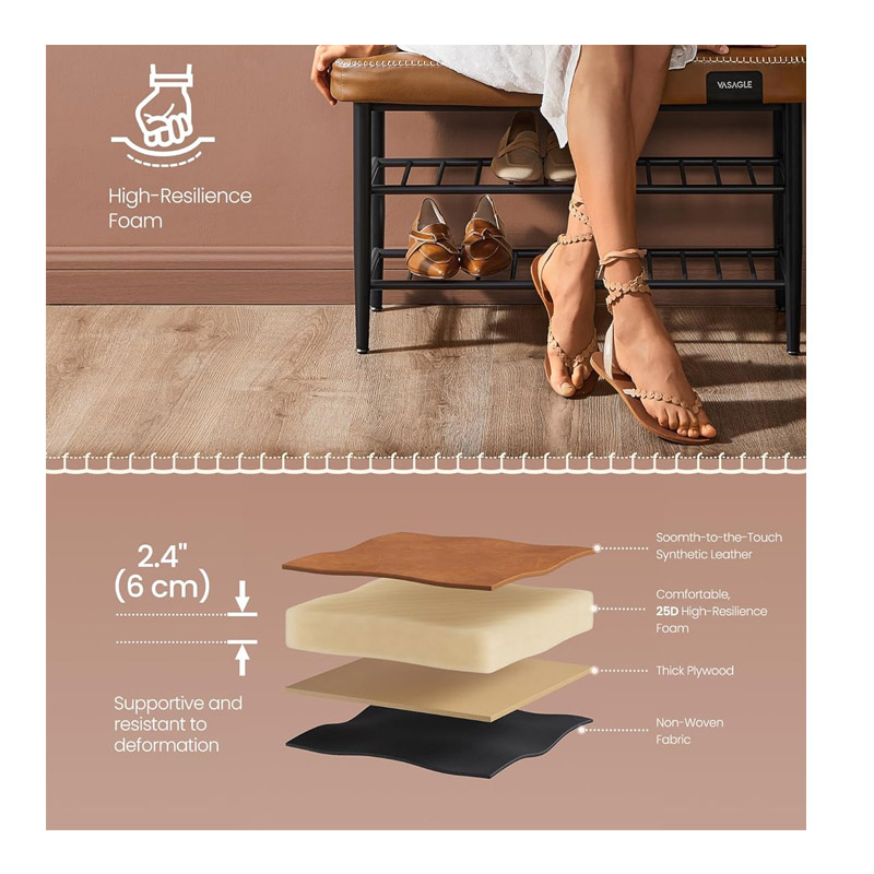 Η παπουτσοθήκη, από την εταιρία VASAGLE, διαθέτει στιβαρό ατσάλινο πλαίσιο, ρυθμιζόμενα πόδια και υποστηρίζει εύκολα έως και 135 Kg βάρος. Εξοπλισμένη με 2 ράφια για παπούτσια και κάθισμα από λείο τεχνητό δέρμα με σφουγγάρι 25D πάχους 8 cm.