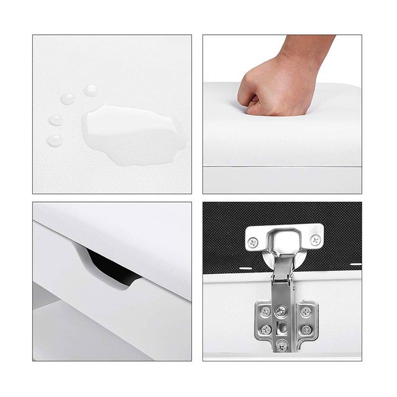 Η παπουτσοθήκη διαθέτει 3 ευρύχωρα ράφια για να αποθηκεύσετε 6 έως 8 ζευγάρια παπούτσια και ένα άνετο κάθισμα με δερμάτινο μαξιλάρι PU σε λευκή απόχρωση. Το επάνω κάλυμμα ανοίγει, έτσι ώστε να είναι δυνατή η αποθήκευση μικρών αντικειμένων, όπως το βερνίκι παπουτσιών, τα κλειδιά ή ακόμη και την ομπρέλα.