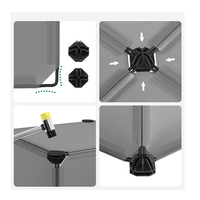 Σημειώσεις: Το προϊόν μπορεί να προσαρμοστεί μόνο στις διαμορφώσεις εντός των ορίων των παρεχόμενων υποδοχών και πλαισίων. Κρατήστε αιχμηρά αντικείμενα και φωτιά μακριά από τις επιφάνειες του προϊόντος. Αποφύγετε την παρατεταμένη έκθεση στο ηλιακό φως. Μην κάθεστε πάνω στο προϊόν και μην βάζετε αντικείμενα με υπερβολικό βάρος. Όλα τα πλαστικά φύλλα πρέπει να πιέζονται στο κάτω μέρος των συνδέσμων με το σφυρί να περιλαμβάνεται κατά τη συναρμολόγηση. Αφού τελειώσετε κάθε στρώση, πιέστε σταθερά κάθε σύνδεσμο για να βεβαιωθείτε ότι η γωνία του σύρματος φτάνει στο κάτω μέρος χωρίς κενό για να προσθέσετε σταθερότητα. Η συσκευή κατά της ανατροπής πρέπει να τοποθετείται όταν το προϊόν είναι πάνω από 60 cm.