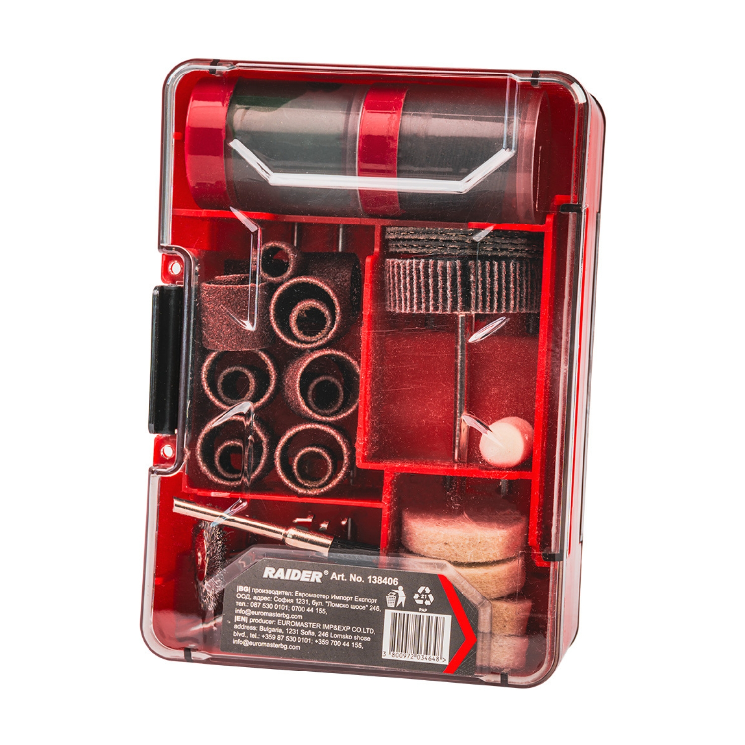 Περιλαμβάνει λειαντικές πέτρες και δίσκους λείανσης για διαμόρφωση και φινίρισμα επιφανειών, μύτες χαρακτικής για λεπτομερείς εφαρμογές σε ξύλο, μέταλλο και γυαλί, δίσκους κοπής για μέταλλο, ξύλο και πλαστικό για ακριβή κοπή, τροχούς στίλβωσης για φινίρισμα και λάμψη, συρμάτινες βούρτσες για αποτελεσματικό καθαρισμό επιφανειών και ιμάντες λείανσης σε διάφορα μεγέθη και κόκκους για μεγαλύτερη ευελιξία. Το σύνολο είναι άριστα οργανωμένο σε μία κασετίνα διευκολύνοντας τη χρήση και αποθήκευση. Είναι διπλής όψης organizer για εύκολη αποθήκευση και πρόσβαση.