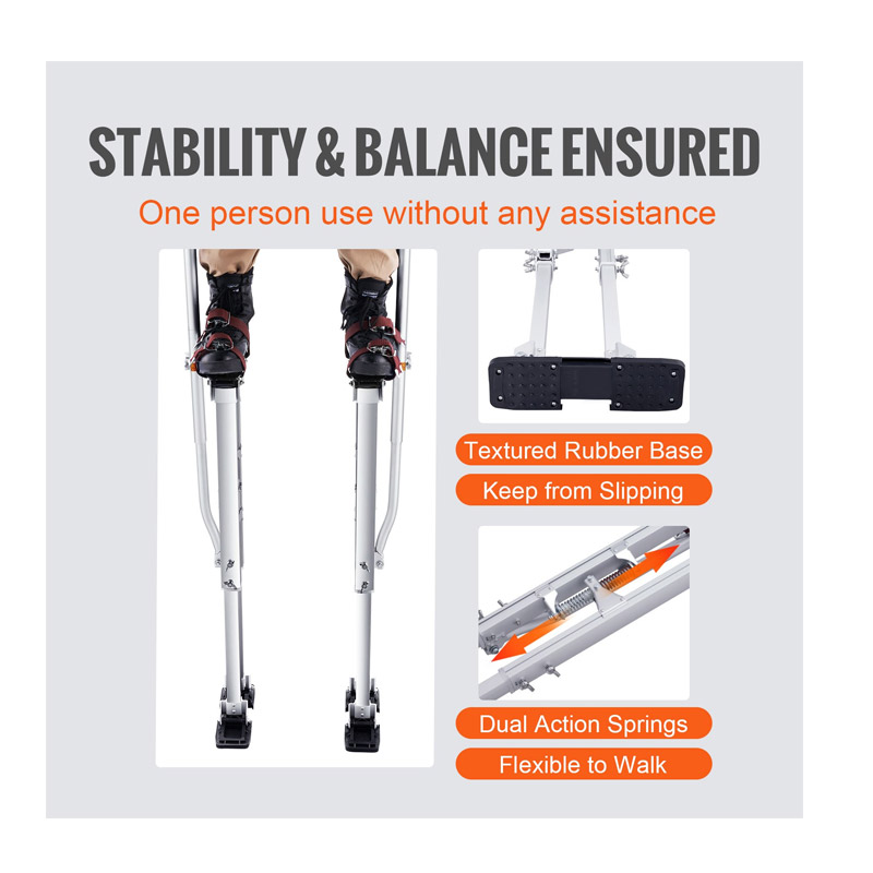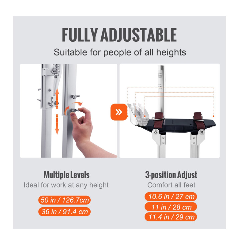 Τα ξυλοπόδαρα, από την εταιρία VEVOR, είναι κατασκευασμένα από στιβαρό κράμα αλουμινίου, με αντοχή στη σκουριά, χωρίς παραμόρφωση και βέλτιστη απόδοση σταθερότητας. Τα ξυλοπόδαρα έχουν μέγιστο βάρος στήριξης 103 Kg. Μέσω των βιδών, έχετε εύκολη ρύθμιση του ύψους από 91.4-126.7 cm για να καλύψετε διάφορες ανάγκες εργασίας. Επιπλέον, χάρη στη σχεδίαση του στηρίγματος φτέρνας 3 θέσεων, χωρούν τα περισσότερα μεγέθη ποδιών που κυμαίνονται από 27-29 cm, εξασφαλίζοντας άνετη χρήση για τους περισσότερους χρήστες.