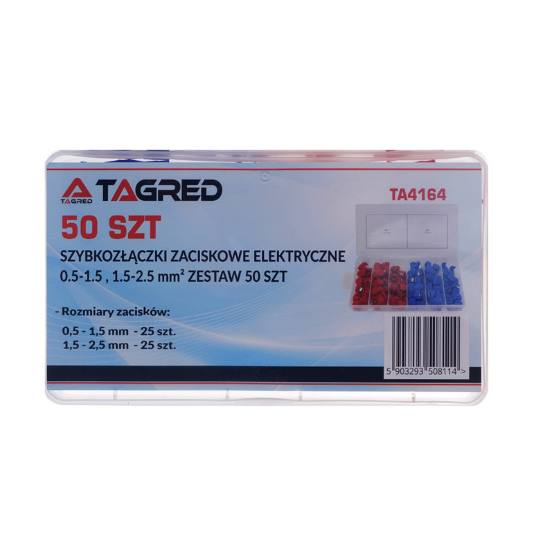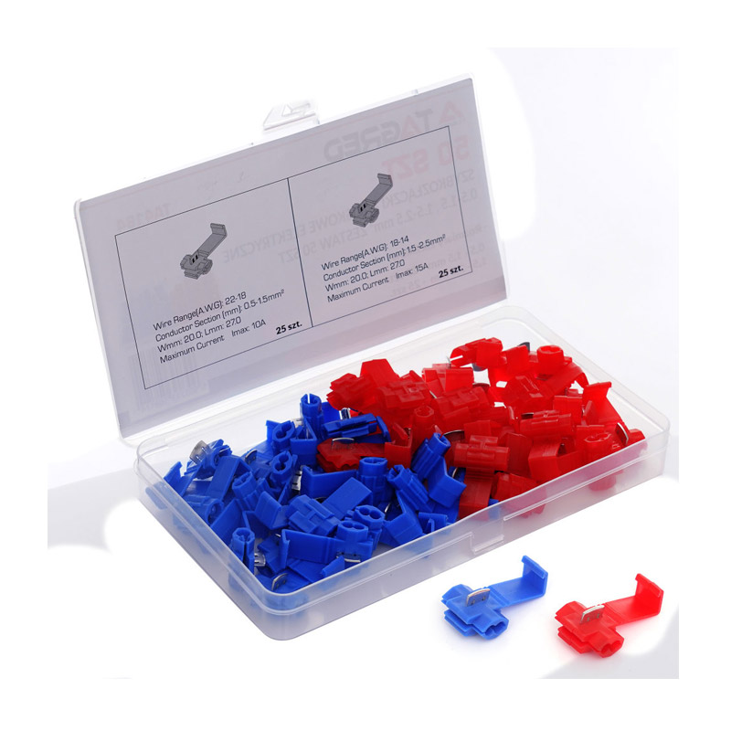 Το σετ, από την εταιρία TAGRED, αποτελείται από 50 κλέμες ταχείας σύνδεσης καλωδίων, σχεδιασμένες για τη σύνδεση δύο τμημάτων καλωδίων χαμηλής τάσης σε ηλεκτρική εγκατάσταση χρησιμοποιώντας σφιγκτήρες.