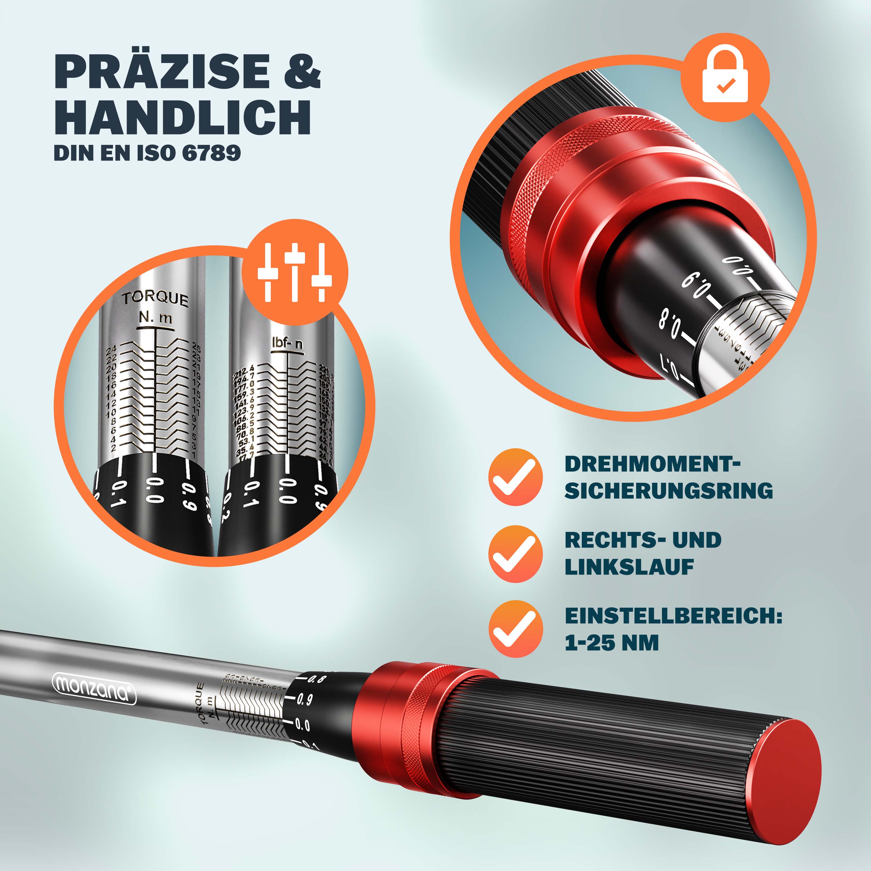 Ο ροπόκλειδος επιτρέπει ακριβή ρύθμιση από 1-25 Nm με ελάχιστη απόκλιση μόλις ± 3%. Μόλις ακούσετε το χαρακτηριστικό κλικ, απελευθερώστε τον ροπόκλειδο και μην ασκείτε πίεση. Το κλικ γίνεται πιο δυνατό σε υψηλότερες ρυθμίσεις και πιο αδύναμο σε χαμηλότερες, δίνοντάς σας ένα σαφές σήμα.