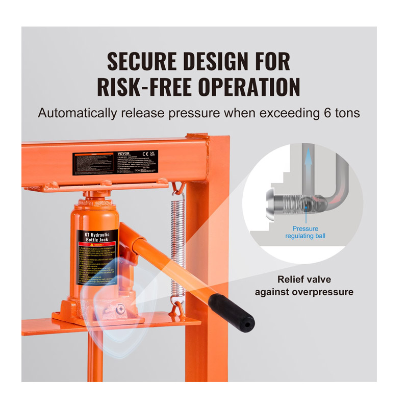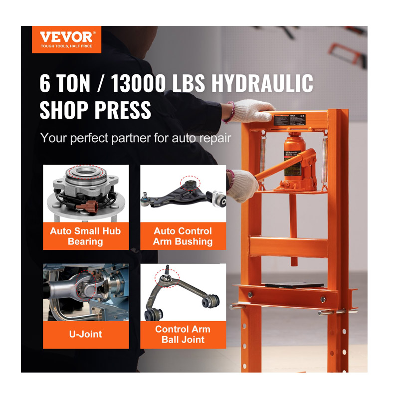 Η υδραυλική πρέσα, από την εταιρία VEVOR, είναι το τέλειο εργαλείο για την αφαίρεση και την εγκατάσταση δακτυλίων αυτοκινήτου, ρουλεμάν, σφαιρικών συνδέσμων, συνδέσμων U, τροχαλιών, γραναζιών και άλλων. Μπορεί επίσης να χρησιμοποιηθεί για εργασίες κατεργασίας μετάλλων όπως κάμψη, ίσιωμα και σφράγιση. Είναι πιστοποιημένη από την DOC International, παρέχοντας ασφάλεια κατά τη χρήση.