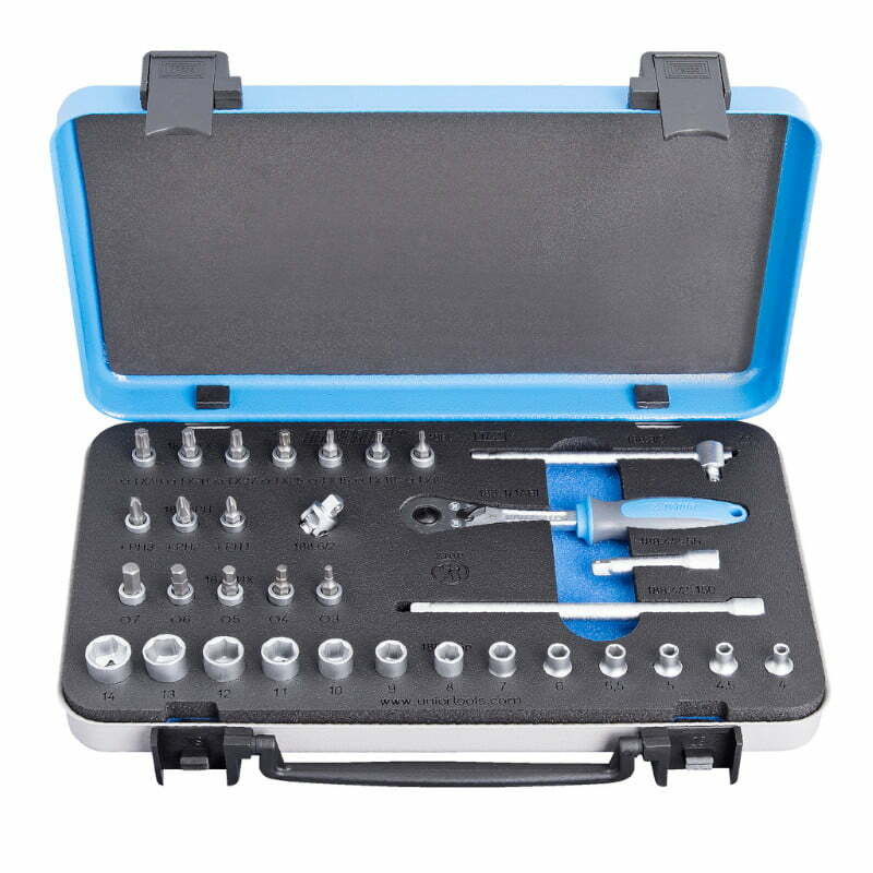 Unior 615151 Συλλογή από Καρυδάκια 1/4" σε Μεταλλική Κασετίνα 33items- 188C 15x screwdriver socket 1/4"; hex (article 187/2HX dim. 3, 4, 5, 6, 7), TX profile (article 187/2TX dim. TX8, TX10, TX15, TX25, TX27, TX30, TX40), crosstip (article 187/2PH dim. PH 1, PH 2, PH 3) 1x reversible ratchet 1/4" accessories 1/4"; 1x sliding T - handle, 2x extension bar (55, 150mm), 1x universal joint