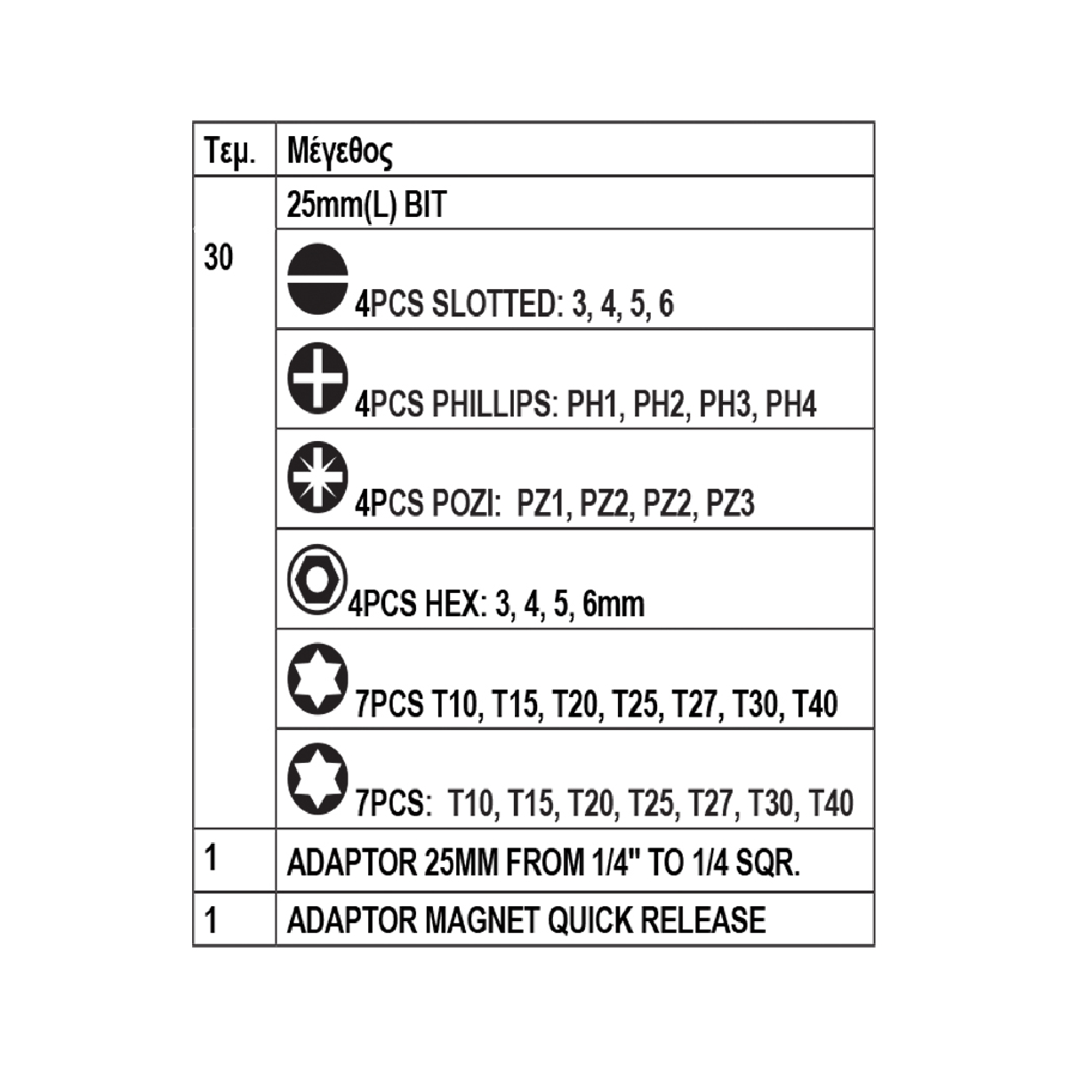 Υλικό: Cr-VΜέγεθος σπειρώματος: 1/4"Μέγεθος: 1/4"Τύπος: 44287Τεμάχια ανά σετ: 32.Μαγνήτης: 1