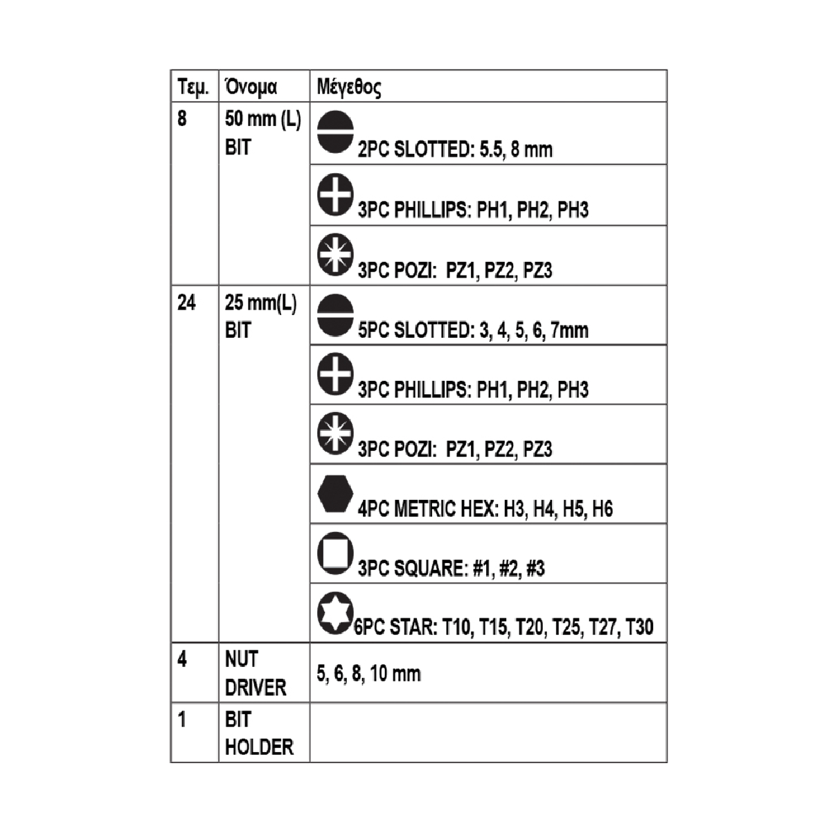 Μέγεθος: 1/4"Τύπος: 44287Μέγεθος σπειρώματος: 1/4"Υλικό: Cr-VΤεμάχια ανά σετ: 37.