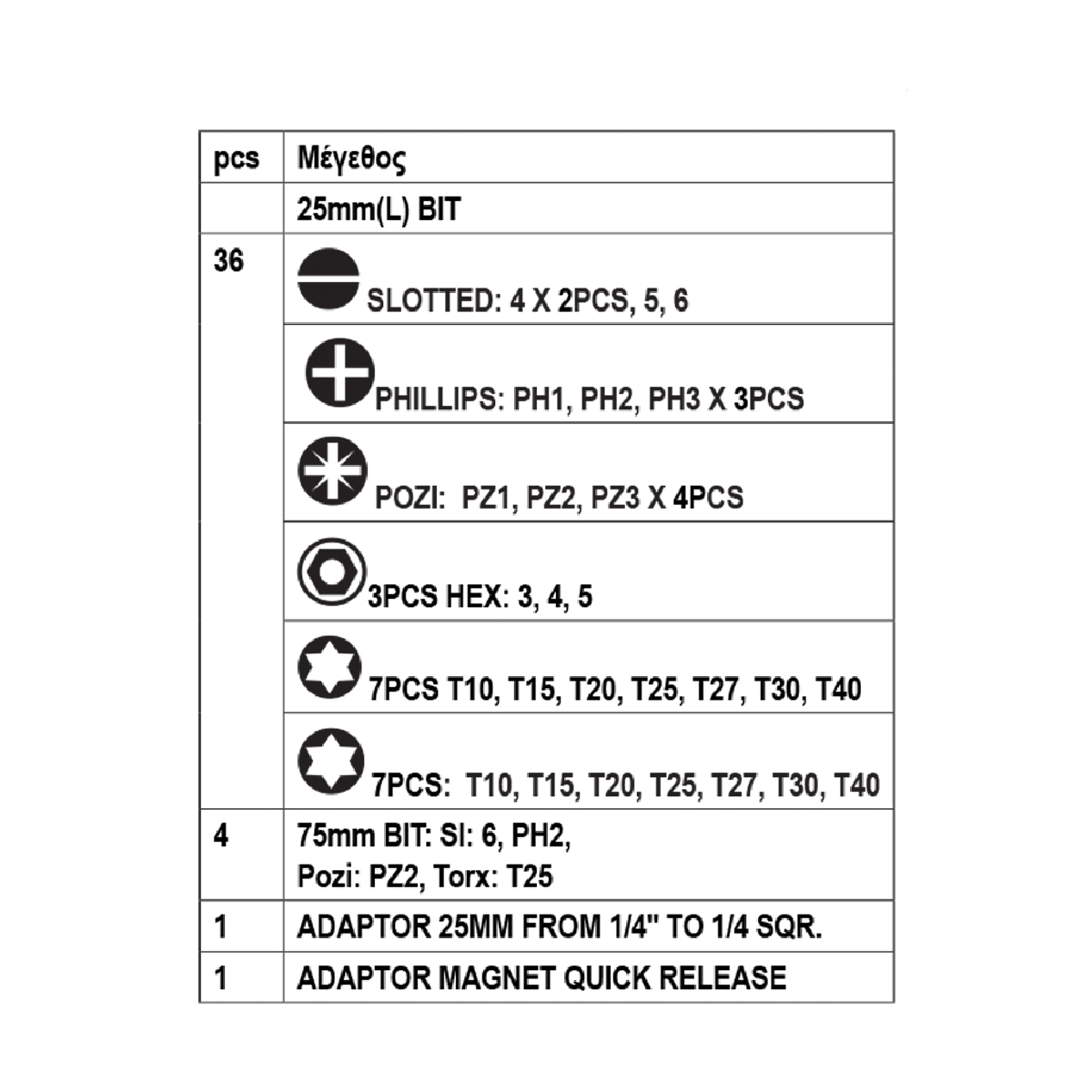 Μέγεθος: 1/4"Μέγεθος σπειρώματος: 1/4"Τύπος: 44287Τεμάχια ανά σετ: 42.Μαγνήτης: 1Υλικό: Cr-V
