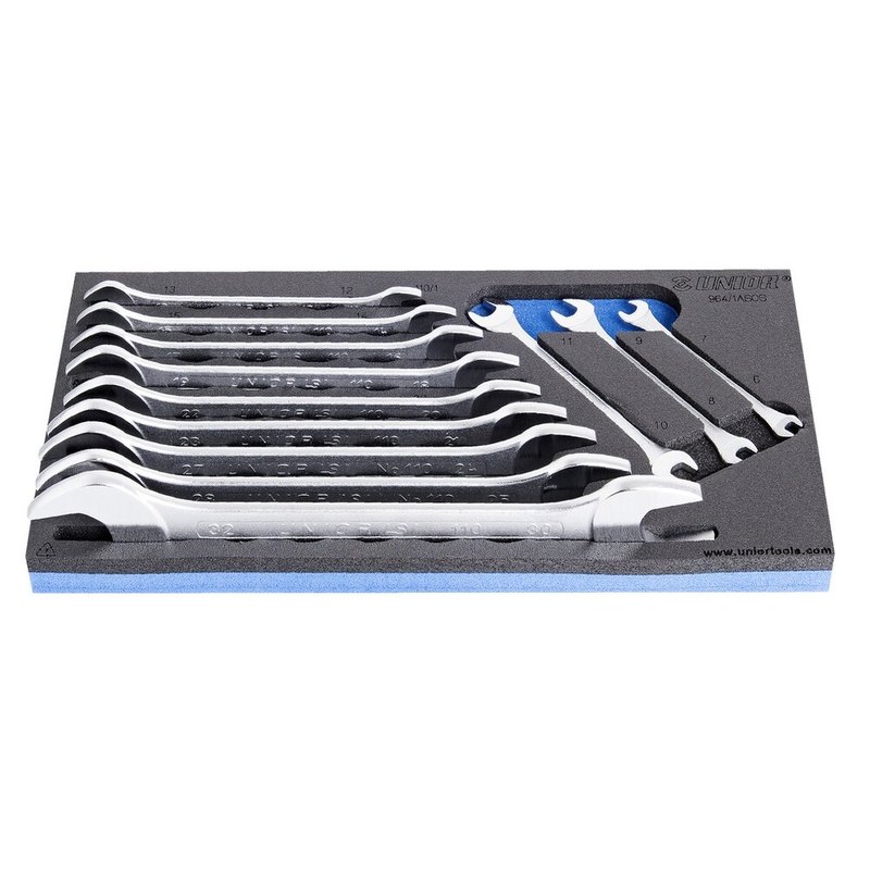 Χαρακτηριστικά για Unior 621050 Σετ Γερμανικών Κλειδιών σε Θήκη SOS 12TMX: Διαστάσεις Θήκη εργαλείων SOS από αφρώδες υλικό: 188 x 364 x 30 mm Συμβατό με συρτάρια της σειράς Eurostyle, Eurovision, Euromotion, Europlus και Hercules (μπροστινά συρτάρια). Το σετ περιλαμβάνει: 12x γερμανικά κλειδιά (article 110/1) dim. 6x7, 8x9, 10x11, 12x13, 14x15, 16x17, 18x19, 20x22, 21x23, 24x27, 25x28, 30x32