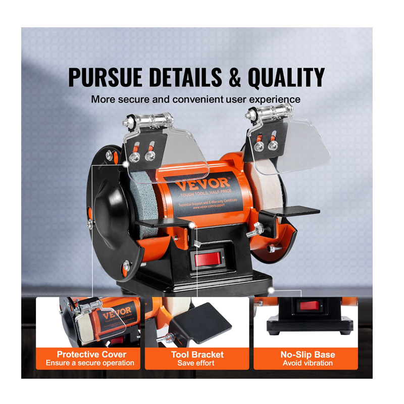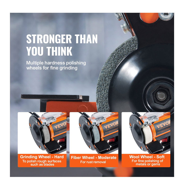 Ο δίδυμος τροχός - λειαντήρας πάγκου, από την εταιρία VEVOR, έχει σχεδιαστεί με κινητήρα χωρίς ψήκτρες με ταχύτητα 3590 rpm. Μπορείτε να εστιάσετε περισσότερο στην εργασία σας με την καλή αντοχή και τον χαμηλό θόρυβο. Επιπλέον, δεν υπάρχει ανάγκη αντικατάστασης της βούρτσας άνθρακα (ουσιαστικά χωρίς συντήρηση). Συνοδεύεται από έναν μαλακό μάλλινο τροχό, έναν τροχό μέτριας ίνας και έναν σκληρό τροχό λείανσης. Οι τρεις τροχοί σκληρότητας σας βοηθούν να γυαλίσετε μια ευρεία γκάμα πολύτιμων λίθων και μετάλλων (είτε τραχιές επιφάνειες γυαλίσματος, λεπτό γυάλισμα ή αφαίρεση σκουριάς).