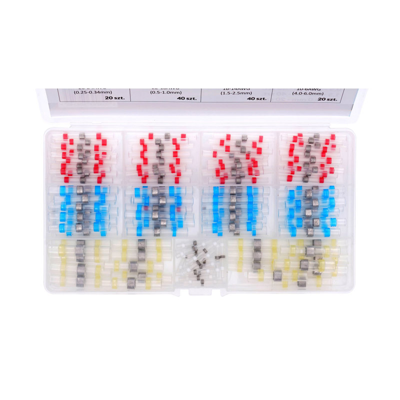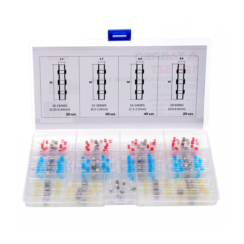 Το σετ, από την εταιρία TAGRED, αποτελείται από θερμοσυστελλόμενα μονωτικά καλωδίων με κασσίτερο, διαφορετικού χρώματος. Χάρη στο κασσίτερο, η σύνδεση των καλωδίων είναι μόνιμη, εξασφαλίζοντας τέλεια επαφή των καλωδίων Συνοδεύονται από κασετίνα αποθήκευσης και μεταφοράς.