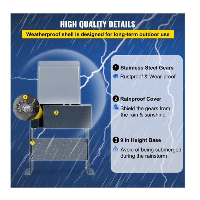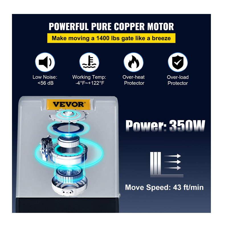 Το αυτόματο μοτέρ συρόμενης γκαραζόπορτας, από την εταιρία VEVOR, είναι κατασκευασμένο με κινητήρα καθαρού χαλκού. Επιπλέον, το βαρέως τύπου και αδιάβροχο κέλυφος μπορεί να προστατεύσει τον κινητήρα από ζημιές. Τα ανοξείδωτα γρανάζια με αδιάβροχο κάλυμμα δεν θα σκουριάσουν ποτέ. Χρησιμοποιείται ευρέως για όλα τα είδη συρόμενων θυρών για να διατηρείτε την ιδιοκτησία σας ασφαλή. Μπορεί να καλύψει τις ανάγκες ιδιωτικών κατοικιών, επιχειρηματικών κοινοτήτων, σχολείων, ξενοδοχείων, αγροκτημάτων, κ.λπ.