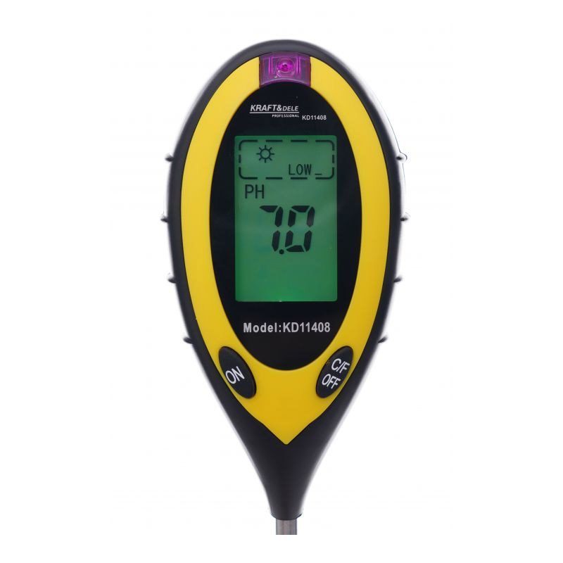 Ο μετρητής εδάφους 4 σε 1, από την εταιρία Kraft&Dele, μπορεί να ελέγξει την υγρασία του εδάφους, την τιμή του pH, τη θερμοκρασία και το ηλιακό φως του περιβάλλοντος με έναν αισθητήρα 200 mm. Μπορεί εύκολα να εμφανίσει διάφορες ενδείξεις στην ευανάγνωστη LCD οθόνη. Διαθέτει ένδειξη χαμηλής μπαταρίας και λειτουργία αυτόματης απενεργοποίησης. Εξοικονομεί χρόνο, ενέργεια και υψηλή απόδοση.