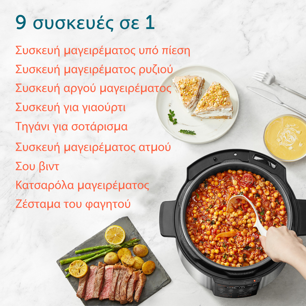 - 9 συσκευές σε 1: Αποκτήστε μια χύτρα ταχύτητας, χύτρα ρυζιού, αργή κουζίνα, συσκευή γιαουρτιού, τηγάνι σοτέ, ατμόπλοιο, sous vide, κατσαρόλα μαγειρέματος και θερμαντήρα φαγητού.