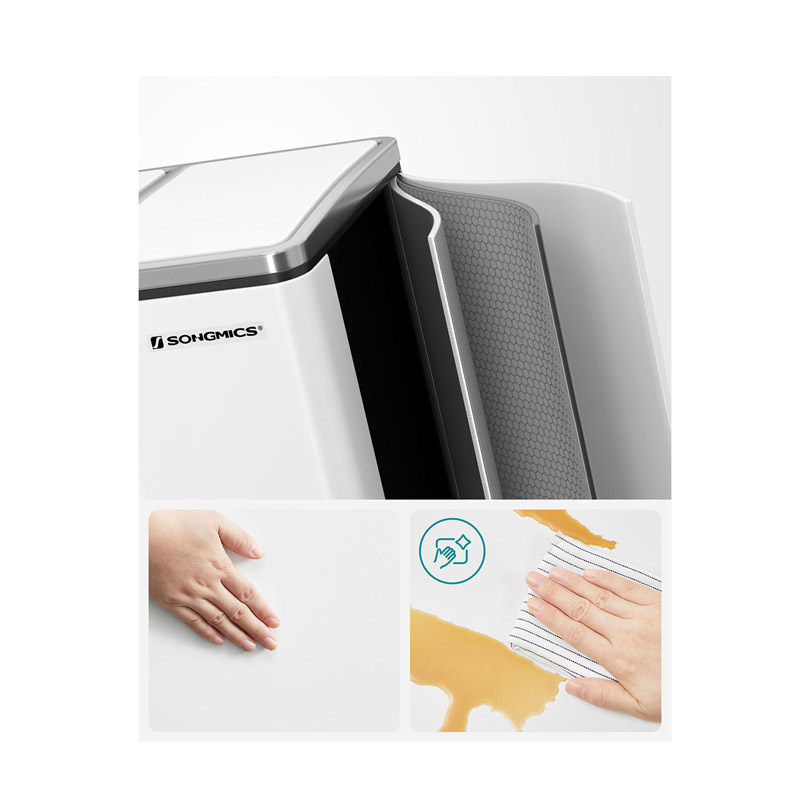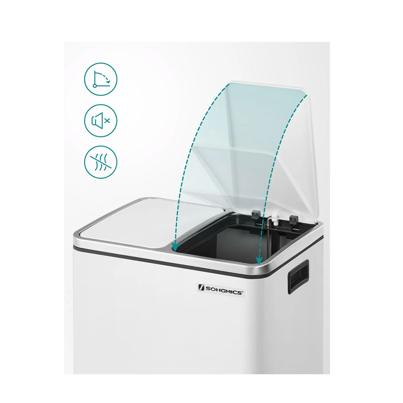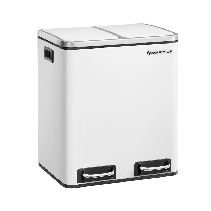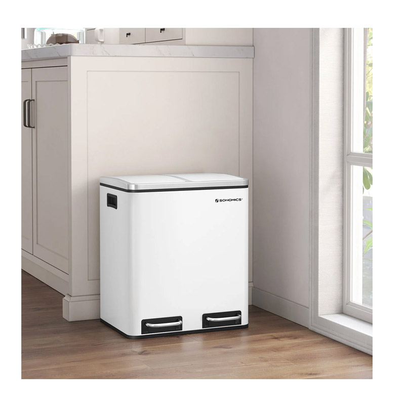 Ο κάδος απορριμμάτων, από την εταιρία Songmics, είναι κατασκευασμένος από ατσάλι. Είναι εξοπλισμένος με 2 αφαιρούμενα πλαστικά διαμερίσματα συνολικής χωρητικότητας 30 Lt (2 x 15 Lt). Είναι εφοδιασμένα με μεταλλικές λαβές μεταφοράς, για να μπορείτε να τα αδειάζετε ξεχωριστά. Επιπρόσθετα, κάθε διαμέρισμα διαθέτει μηχανισμό με αντιολισθητικό πεντάλ, ώστε η απόρριψη των απορριμμάτων να πραγματοποιείται με απολύτως άνετο και υγιεινό τρόπο.