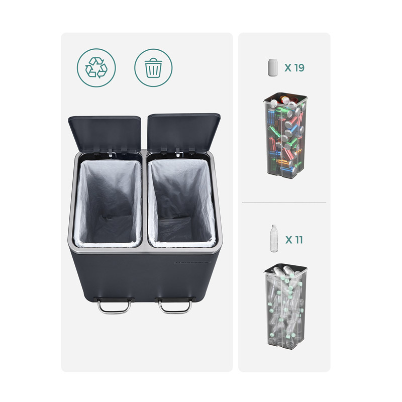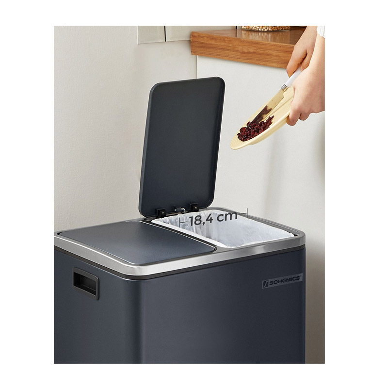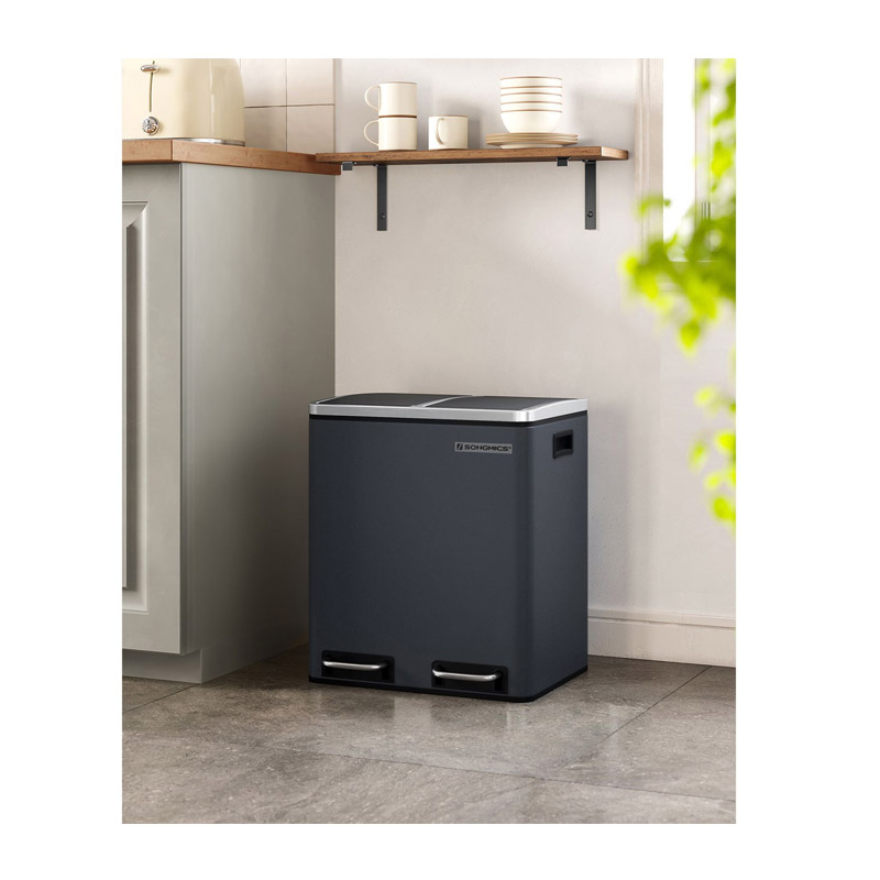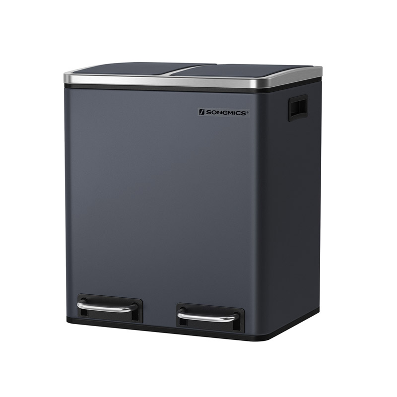 Ο κάδος απορριμμάτων, από την εταιρία Songmics, είναι κατασκευασμένος από ατσάλι. Είναι εξοπλισμένος με 2 αφαιρούμενα πλαστικά διαμερίσματα συνολικής χωρητικότητας 30 Lt (2 x 15 Lt). Είναι εφοδιασμένα με μεταλλικές λαβές μεταφοράς, για να μπορείτε να τα αδειάζετε ξεχωριστά. Επιπρόσθετα, κάθε διαμέρισμα διαθέτει μηχανισμό με αντιολισθητικό πεντάλ, ώστε η απόρριψη των απορριμμάτων να πραγματοποιείται με απολύτως άνετο και υγιεινό τρόπο.