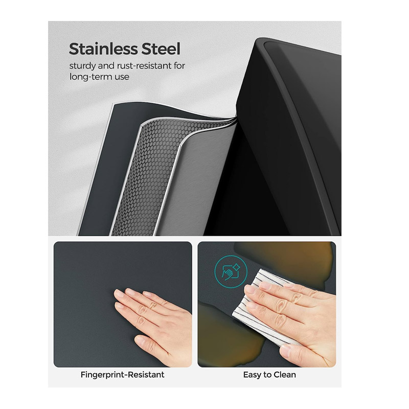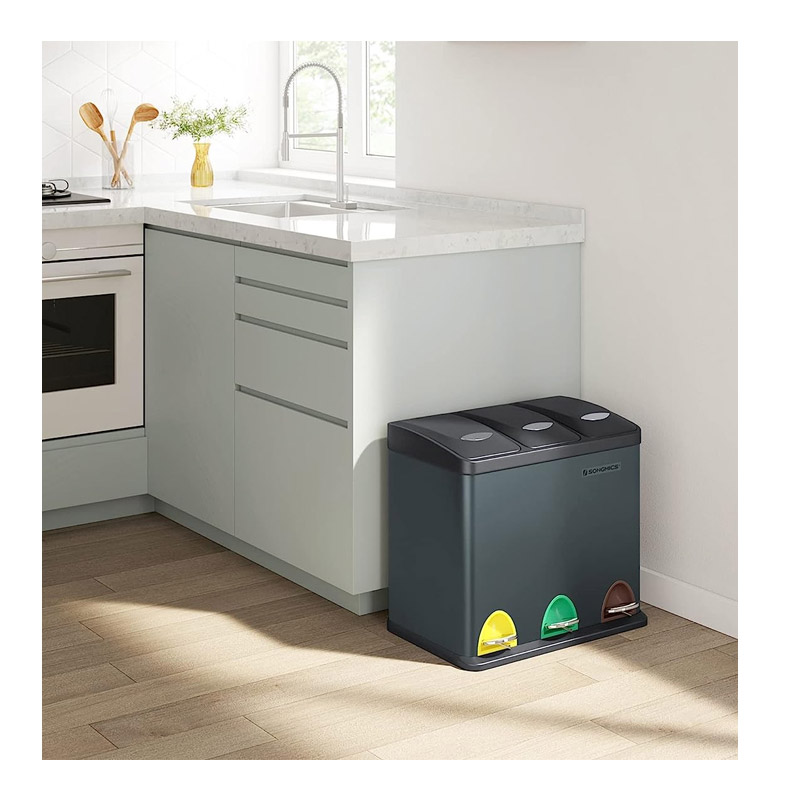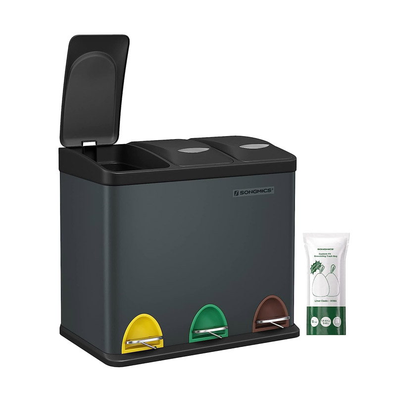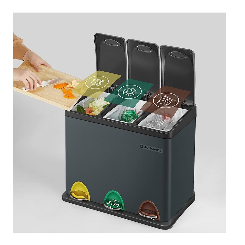 Ο κάδος απορριμμάτων, από την εταιρία Songmics, είναι κατασκευασμένος από ανοξείδωτο ατσάλι με πλαστική βάση και λεία επιφάνεια, χαρακτηριστικό που ευνοεί τον εύκολο καθαρισμό. Είναι εξοπλισμένος με 3 αφαιρούμενα πλαστικά διαμερίσματα συνολικής χωρητικότητας 24 Lt (3 x 8 Lt). Είναι εφοδιασμένα με μεταλλικές λαβές μεταφοράς, για να μπορείτε να τα αδειάζετε ξεχωριστά. Επιπρόσθετα, κάθε διαμέρισμα διαθέτει μηχανισμό με αντιολισθητικό πεντάλ, ώστε η απόρριψη των απορριμμάτων να πραγματοποιείται με απολύτως άνετο και υγιεινό τρόπο.