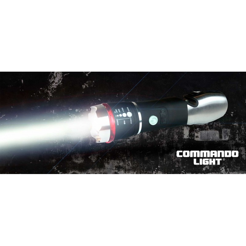 Η ανθεκτική κατασκευή του από ανοξείδωτο ατσάλι δεν πρόκειται να σε απογοητεύσει, ενώ η λαβή του από αντικολλητικό καουτσούκ εγγυάται το σταθερό πιάσιμο. Είναι ανθεκτικό στο νερό και τη σκόνη. Λειτουργεί για ώρες με επαναφορτιζόμενη μπαταρία ιόντων λιθίου (περιλαμβάνεται), ενώ η φόρτιση της γίνεται με καλώδιο USB, πράγμα που θα σου λύσει τα χέρια. Φόρτισε το Commando Light ακόμη και μέσα στο αμάξι!