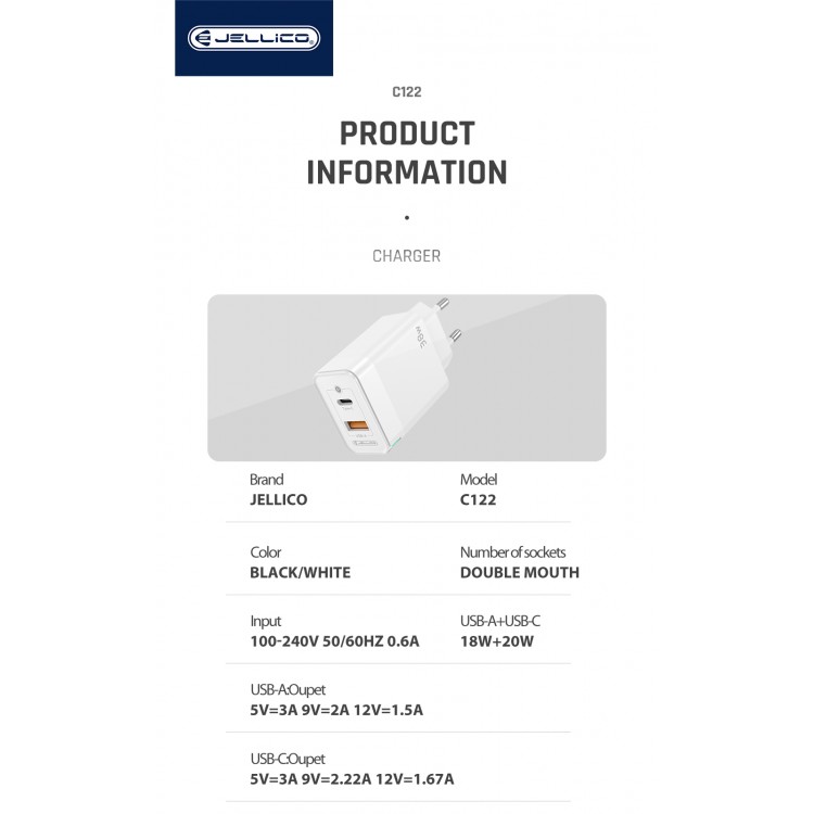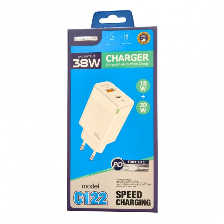 jager ΦΟΡΤΙΣΤΗΣ 38W FAST CHARGER + ΚΑΛΩΔΙΟ TYPE C / TYPE C - 1 ΘΥΡA USB - 1 ΘΥΡΑ TYPE C (C122-2989)
