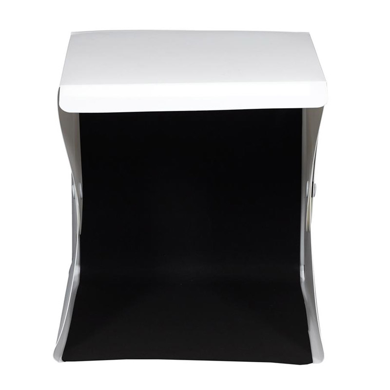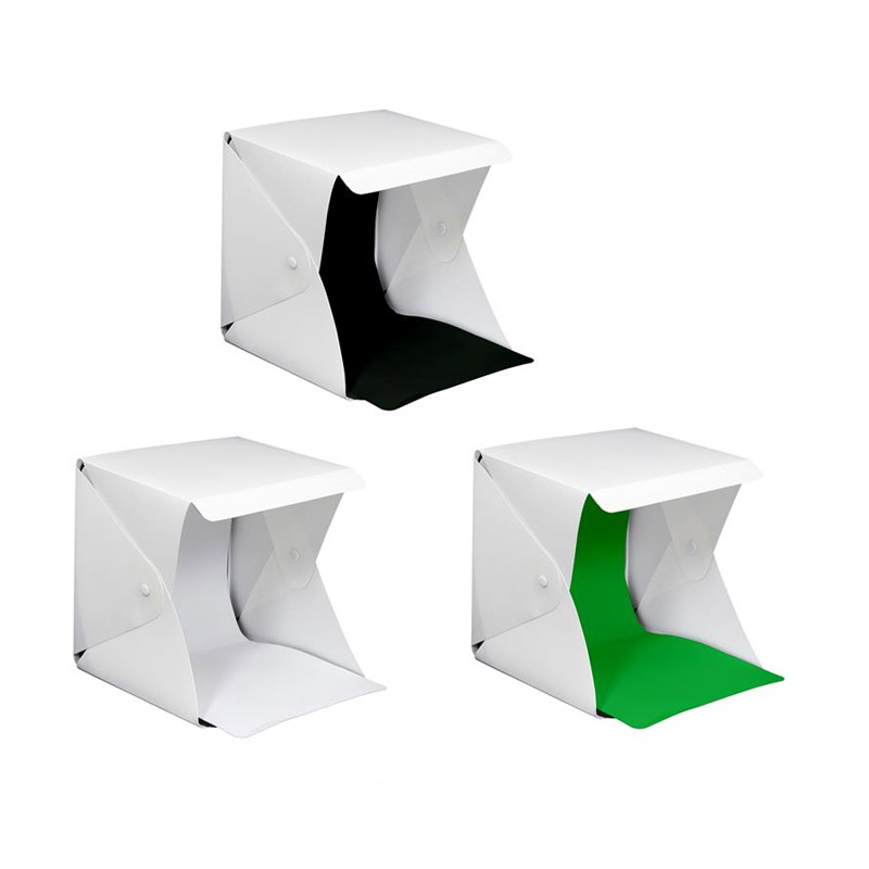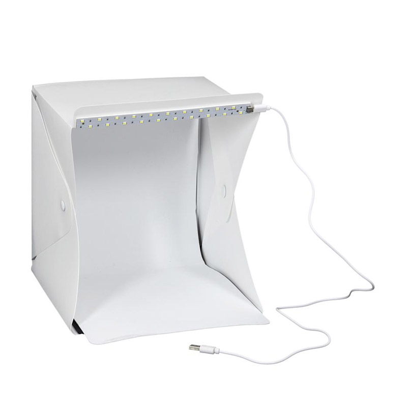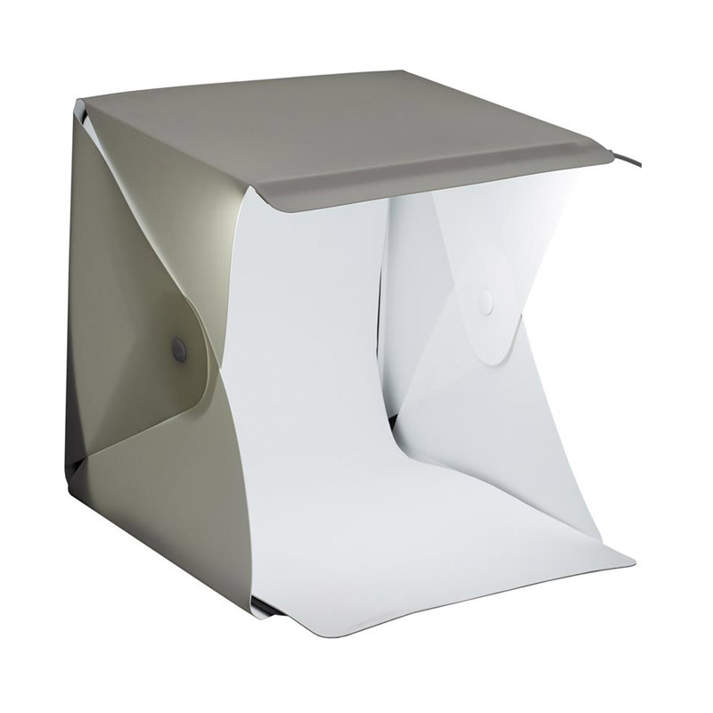 Το στούντιο είναι αναδιπλούμενο, ώστε να μπορείτε εύκολα να το μεταφέρετε ή να το αποθηκεύσετε. Στο πάνω μέρος μια λωρίδα με 20 LED φώτα, σε λευκό ουδέτερο φως, που τροφοδοτείται από ένα καλώδιο USB (συμπεριλαμβάνεται). Για να ενεργοποιήσετε τα φώτα, απλά συνδέετε το καλώδιο USB στο laptop, στο tablet, στο φορτιστή, ή στην πρίζα. Εκτός από το καλώδιο τροφοδοσίας, το σετ περιλαμβάνει 3 υπόβαθρα, λευκό, μαύρο και πράσινο, καθώς και οι οδηγίες χρήσεως.