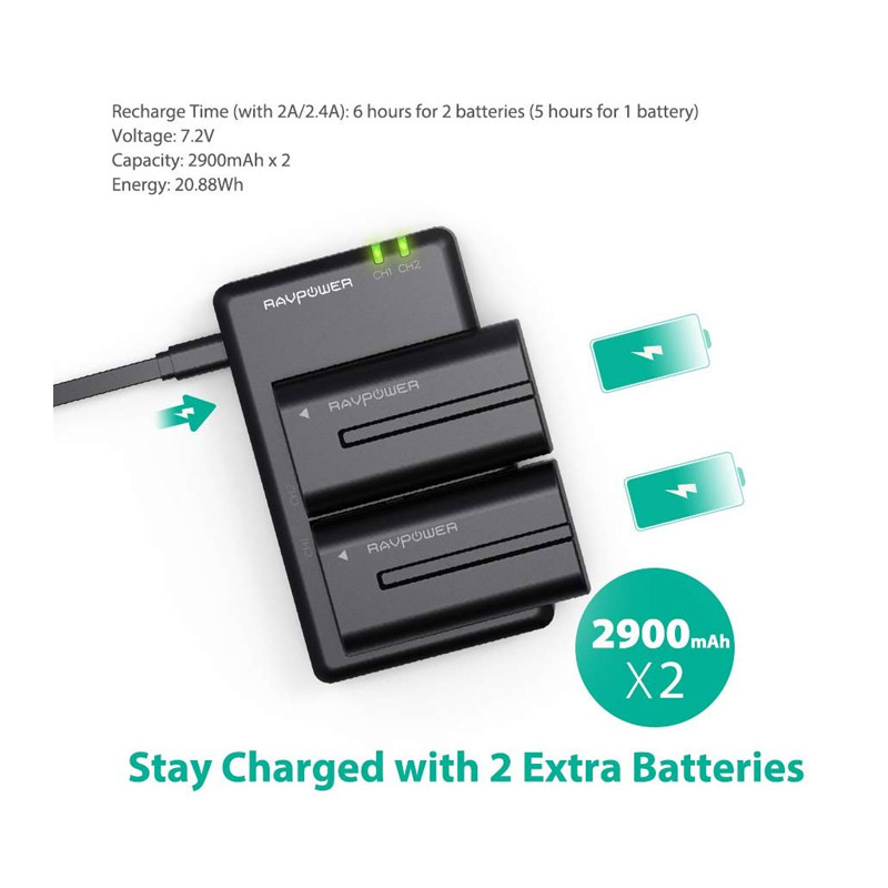 Το σετ, από την εταιρία RAVPower, αποτελείται από 2 επαναφορτιζόμενες μπαταρίες με χωρητικότητα 2900 mAh/20.88 Wh η καθεμία. Στην πραγματική χρήση, αυτό μεταφράζεται σε έως και 4 ώρες εγγραφής βίντεο/μπαταρία, ώστε να έχετε άφθονο χρόνο για να απαθανατίσετε τις ιδιαίτερες στιγμές της ζωής σας. Διαθέτουν προστασία από υπερφόρτιση, υπερφόρτιση, υπέρταση, βραχυκύκλωμα και υπερθέρμανση.