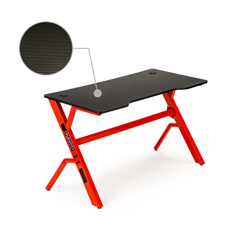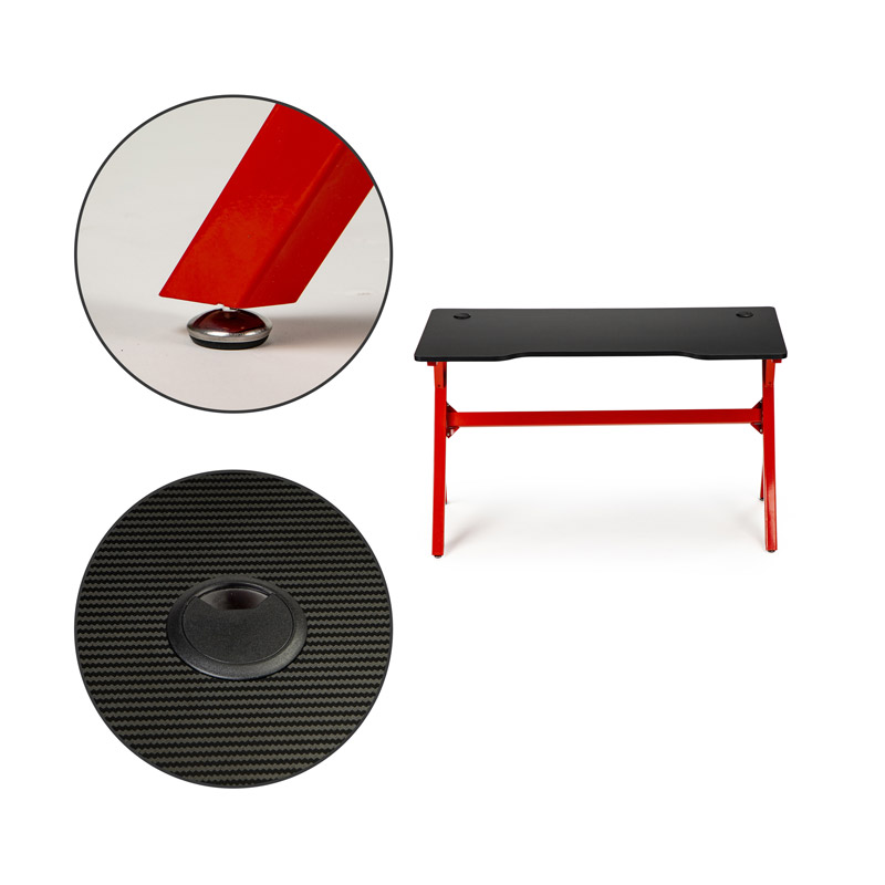 Το γραφείο gaming, από την εταιρία ModernHome, διαθέτει μεταλλικά πόδια και επιφάνεια από MDF ξύλο πάχους 18 mm. Η επένδυση της επιφάνειας του γραφείου είναι με carbon fiber (ανθρακόνημα) το οποίο αποτελείται από λεπτά, ισχυρά κρυσταλλικά νημάτια άνθρακα που προσφέρουν υψηλή αντοχή στα γρατζουνίσματα και την υψηλή θερμότητα. Δύο δίοδοι καλωδίων, τοποθετημένες στην επιφάνεια, θα σας βοηθήσουν να οργανώσετε τα καλώδια.