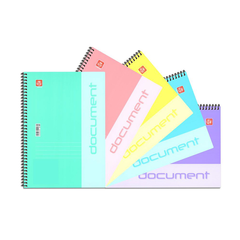 Document τετράδιο σπιράλ 3 θεμάτων A4 (21x29,7). Με εξώφυλλο πλαστικοποιημένο 350 γρ. και με σκληρό οπισθόφυλλο για να μπορείς να γράφεις σταθερά. Τα φύλλα είναι από εξαιρετικής ποιότητας χαρτί 70γρ. και η γραμμογράφηση είναι ριγέ. Είναι 3 θεμάτων, με διαχωριστικό για μεγαλύτερη ευκολία. Διατίθεται σε 5 παστέλ χρώματα (ροζ, κίτρινο, μέντα, μωβ, γαλάζιο). Η συσκευασία είναι ανάμεικτων χρωμάτων σε πακέτο των 10τεμ.