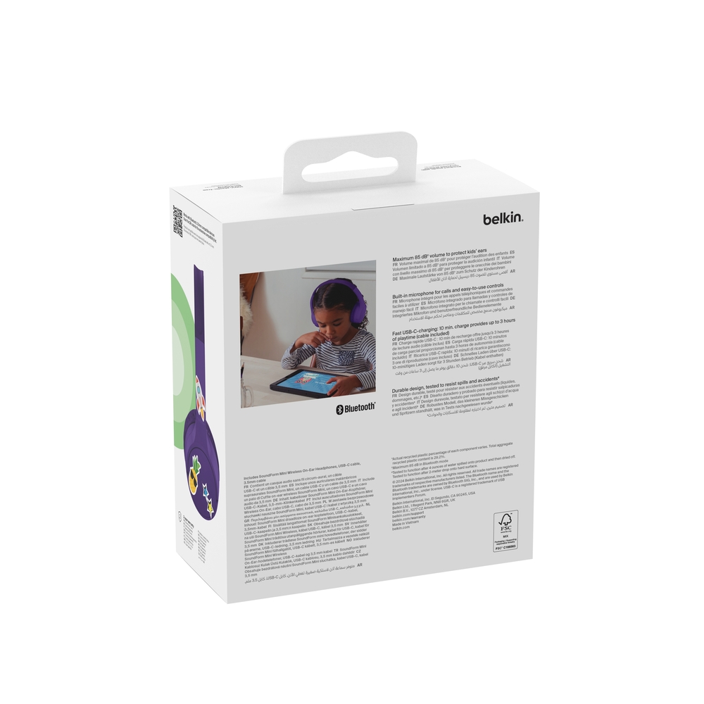 Τα ασύρματα ακουστικά Belkin SoundForm Inspire είναι ειδικά κατασκευασμένα για να προσφέρουν στα παιδιά (3 ετών και άνω) μια ασφαλή και διασκεδαστική εμπειρία ακρόασης. Είτε πρόκειται για εξ αποστάσεως μάθηση, είτε για την παρακολούθηση αγαπημένων ταινιών στο αυτοκίνητο, αυτά τα ακουστικά είναι ο ιδανικός σύντροφος για τις καθημερινές τους περιπέτειες.