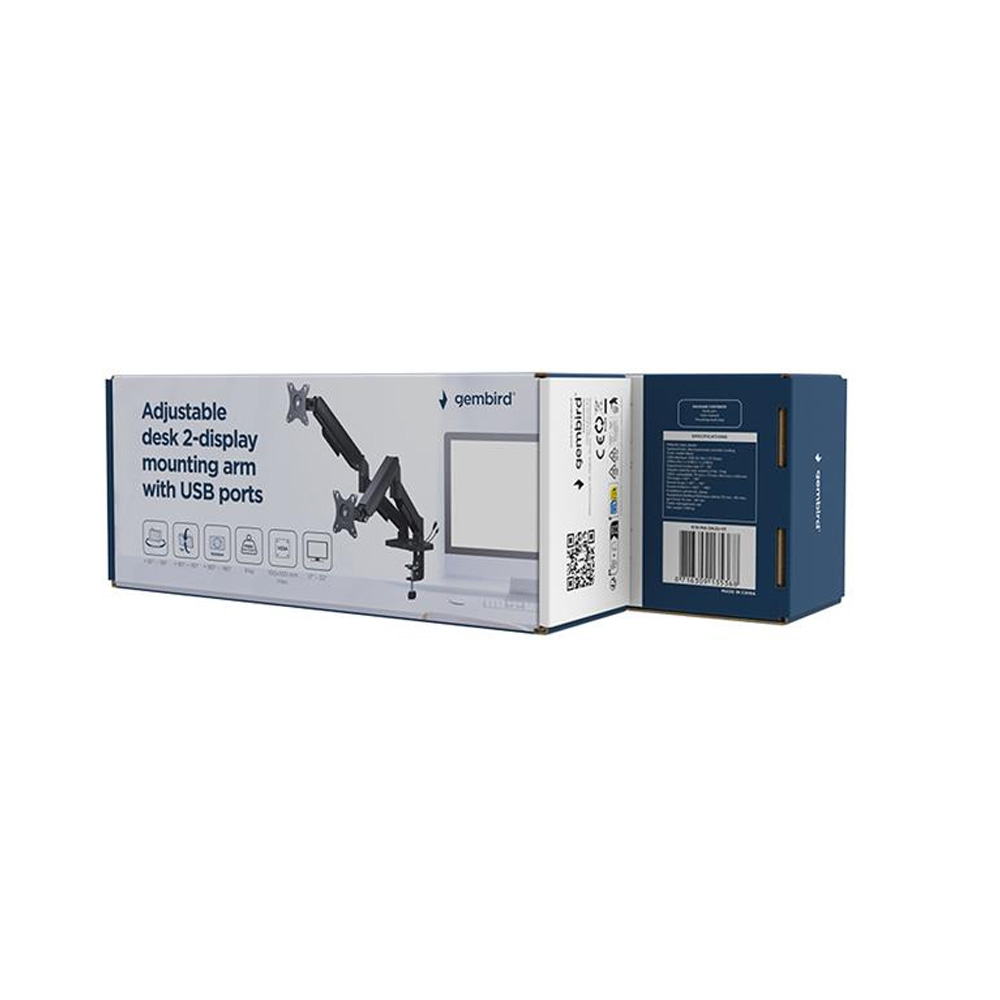 GEMBIRD ADJUSTABLE DESK 2-DISPLAY MOUNTING ARM WITH USB PORTS, 17”-32” BLACK