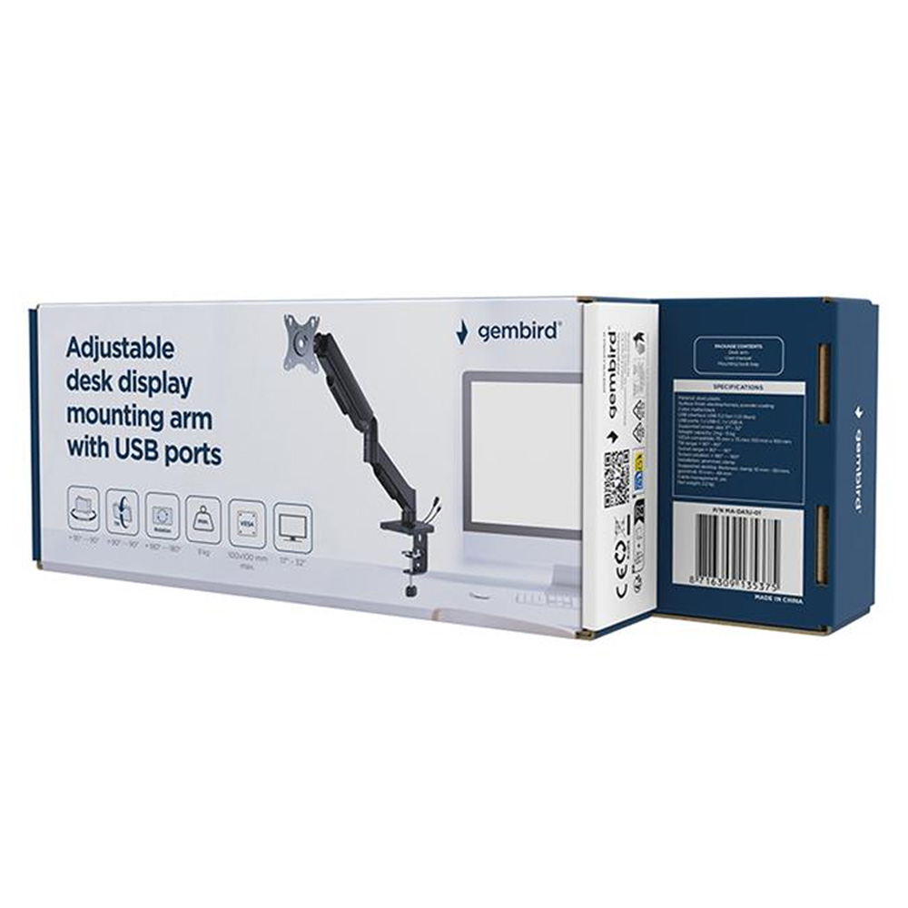 GEMBIRD ADJUSTABLE DESK DISPLAY MOUNTING ARM WITH USB PORTS, 17”-32” BLACK