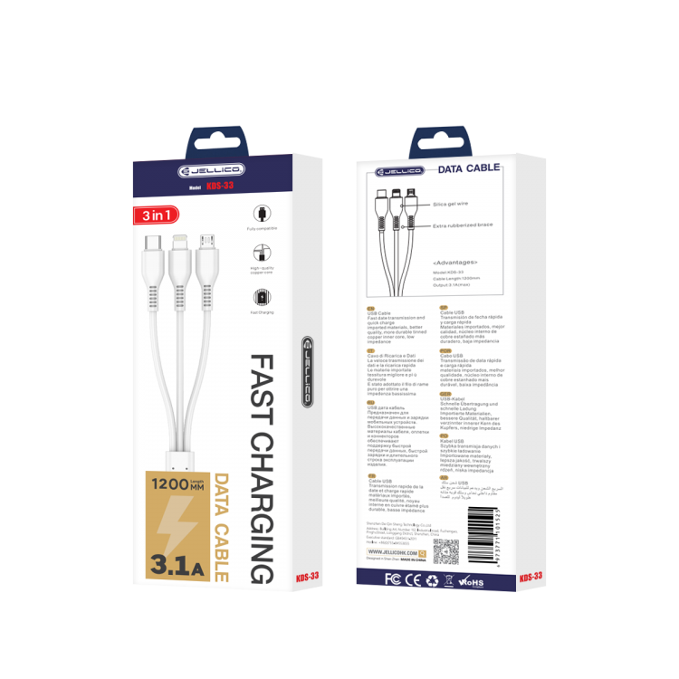 jager ΚΑΛΩΔΙΩΣΗ USB - TYPE C / LIGHTNING / MICRO 1,2Μ 3.1A FAST CHARGE (KDS-33)