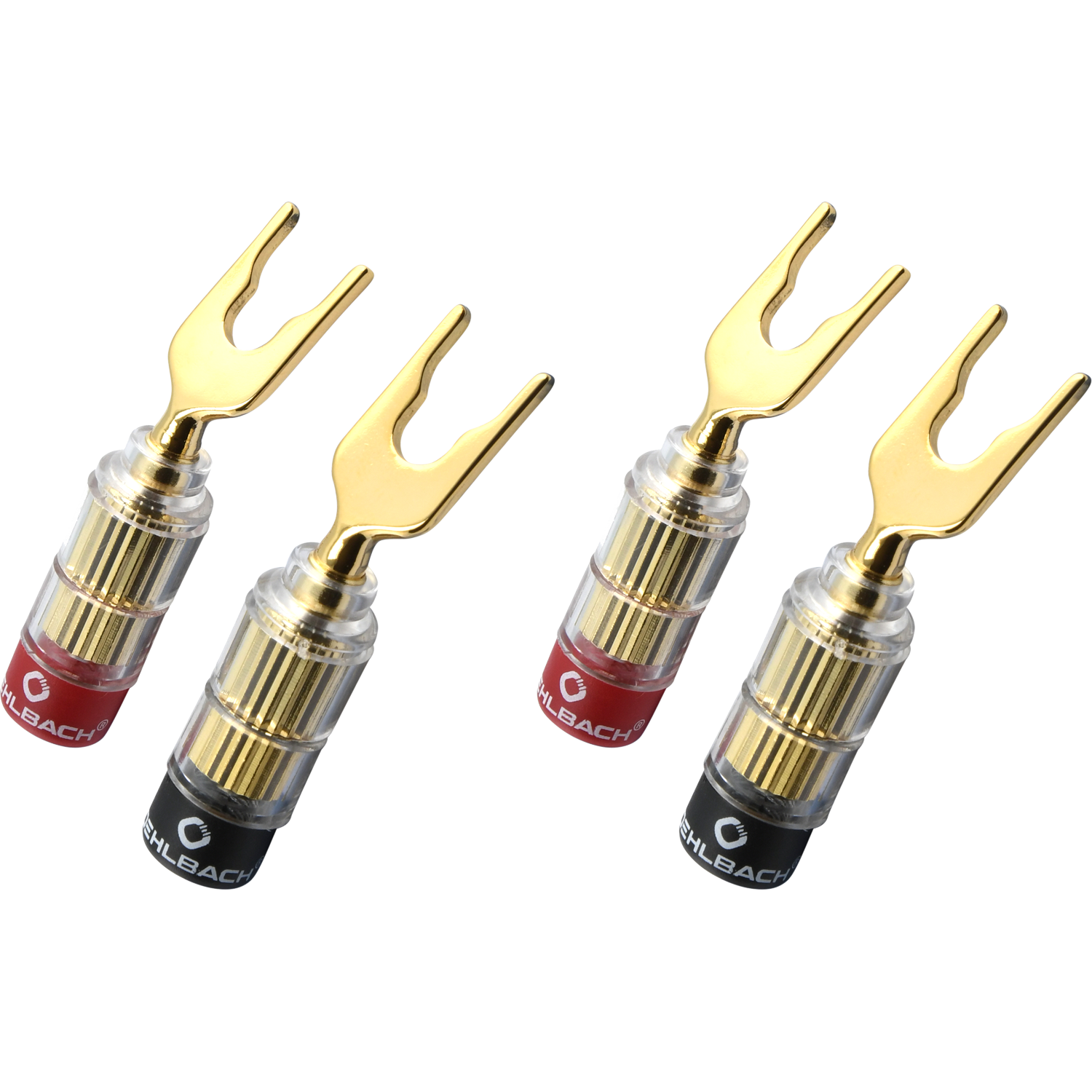 Excellent cable lug connector for assembling speaker cables. The connector ensures the optimal and convenient connection of speaker cables to speaker boxes and electronic components, such as AV receivers or amplifiers. Thanks to a new type of connection system, this high-quality Oehlbach connector ensures absolutely secure contact and excellent transmission quality. The adapter is simply screwed on and the speaker cable is inserted into the lower part. Then the wire ends are put over the thread and is screwed together with the upper part. The plug contacts are 24 carat gold-plated and the cable feed is suitable for conductor cross-sections from 1.5mm² to 6.0 mm².1.5 mm² to 6.0 mm²Cable lug connector for loudspeakerReliable contact24kt gold plated contactsTECHNICAL DATAColour: Gold Connection type: Audio Connector material: solid metal plug Surface condition: 24 carat gold-plated contacts cable cross section: Up to 6 mm² cable cross-section Lieferumfang: 4x cable lug stekcer