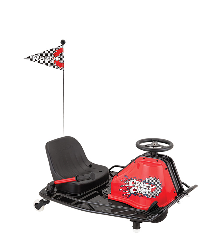 Drive, spin, or drift like a pro – at home! Drive like a go cart or lift the Drift Bar to kick into Crazy Cart mode. Patented drift system allows the driver to vary the rear caster angle so you can drive and drift forward, backward, sideways, diagonally, and everything in between! Another revolution in riding from Razor.