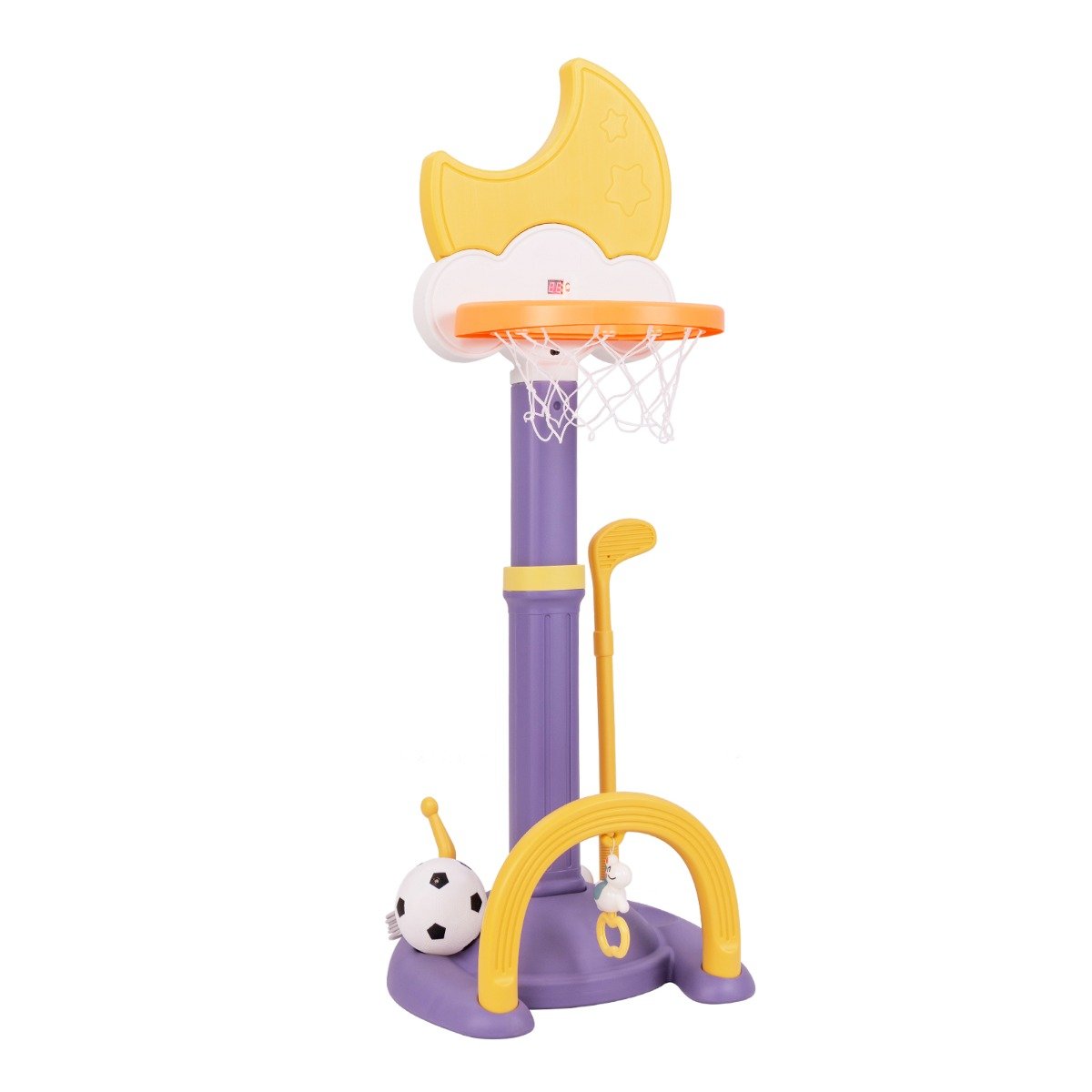 Κρατήστε το παιδί σας διασκεδαστικό και ενεργό με αυτό το 4-σε-1 κέντρο αθλητικών δραστηριοτήτων. Με τα παιχνίδια μπάσκετ, ποδόσφαιρο, γκολφ και ρίψη δαχτυλιδιών, αυτό το φιλικό προς τα παιδιά σετ προσφέρει ατελείωτη διασκέδαση σε μια συμπαγή συσκευή. Το ρυθμιζόμενο σε ύψος καλάθι μπάσκετ μεγαλώνει με το παιδί σας, προσφέροντας διαρκή χαρά σε παιδιά κάθε ηλικίας και μεγέθους. Η σταθερή βάση εξασφαλίζει σταθερότητα κατά τη διάρκεια του παιχνιδιού. Αυτό το ευέλικτο σετ παιχνιδιού είναι ένα τέλειο δώρο για την προώθηση της σωματικής δραστηριότητας και τη μείωση του χρόνου οθόνης, υποστηρίζοντας παράλληλα την ανάπτυξη και την ευχαρίστηση του παιδιού σας.