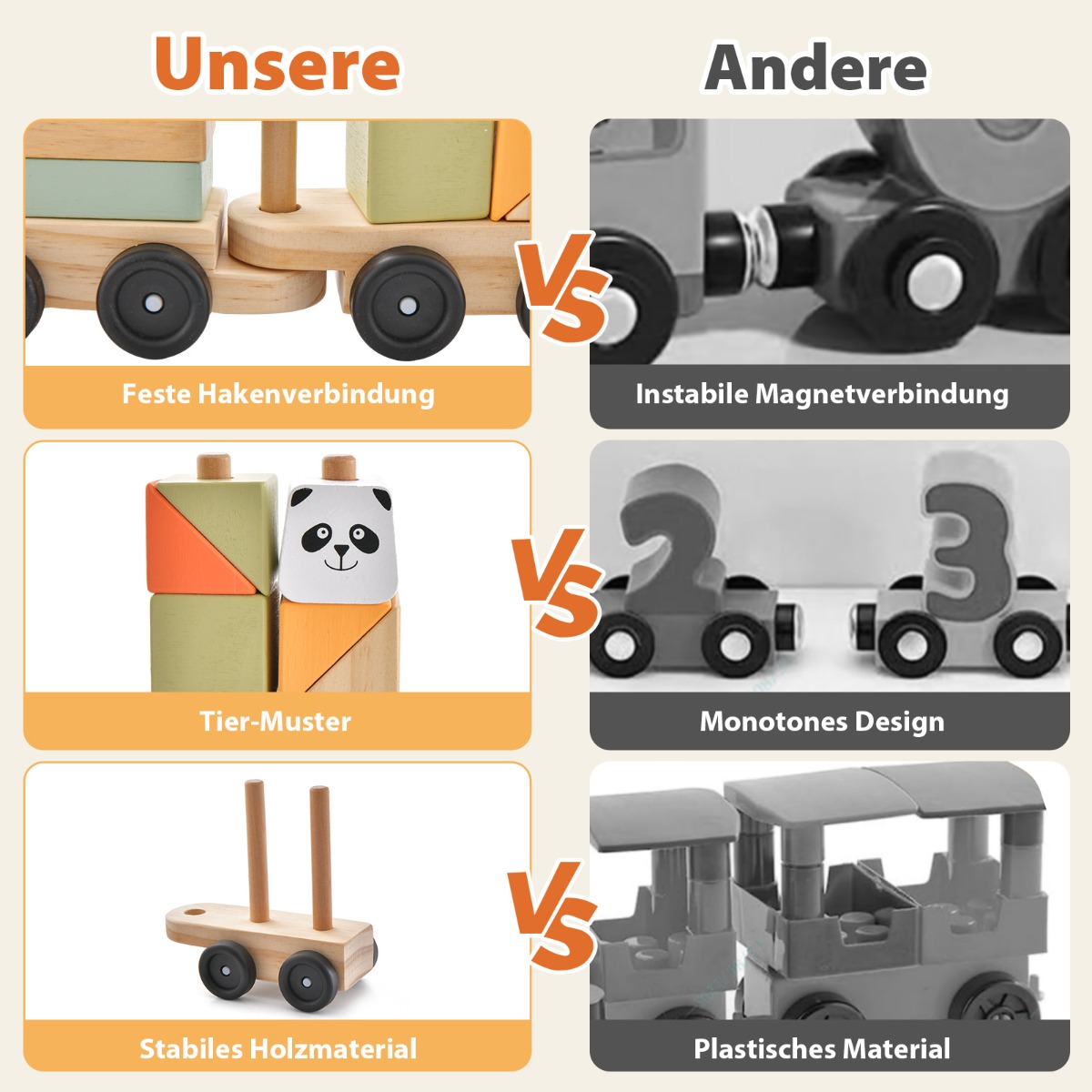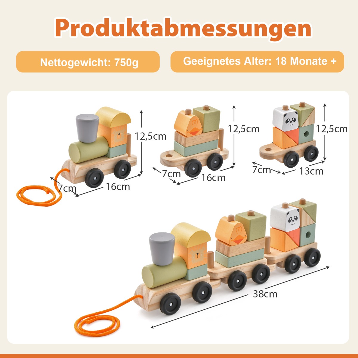 Ψάχνετε το τέλειο παιχνίδι τρένου για το παιδί σας; Η αναζήτησή σας μπορεί να τελειώσει εδώ! Το σετ παιχνιδιού τρένου μας είναι ακριβώς αυτό που θέλετε. Με 1 ατμομηχανή, 2 βαγόνια και 14 ξύλινα μπλοκ σε διάφορα σχήματα και μοτίβα, αυτό το τρένο επιτρέπει στο παιδί σας να δημιουργήσει και να ανακατασκευάσει κάθε τμήμα του τρένου με δημιουργικότητα, αφήνοντας τη φαντασία του ελεύθερη για ατελείωτες δυνατότητες. Επιπλέον, είναι κατασκευασμένο από υψηλής ποιότητας, ανθεκτικό ξύλο, ώστε να αντέχει ακόμα και στο πιο έντονο παιχνίδι. Σε αντίθεση με άλλα παιχνίδια τρένων με μονότονο σχεδιασμό και πλαστικό υλικό, το ξύλινο σετ τρένου μας διαθέτει χαριτωμένο σχήμα και γοητευτικά μοτίβα ζώων, καθιστώντας το ακαταμάχητο για τα παιδιά. Το προσαρτημένο σχοινί ρυμούλκησης επιτρέπει εύκολη έλξη, διεγείρει τις λεπτές κινητικές δεξιότητες και ενθαρρύνει το φανταστικό παιχνίδι.
