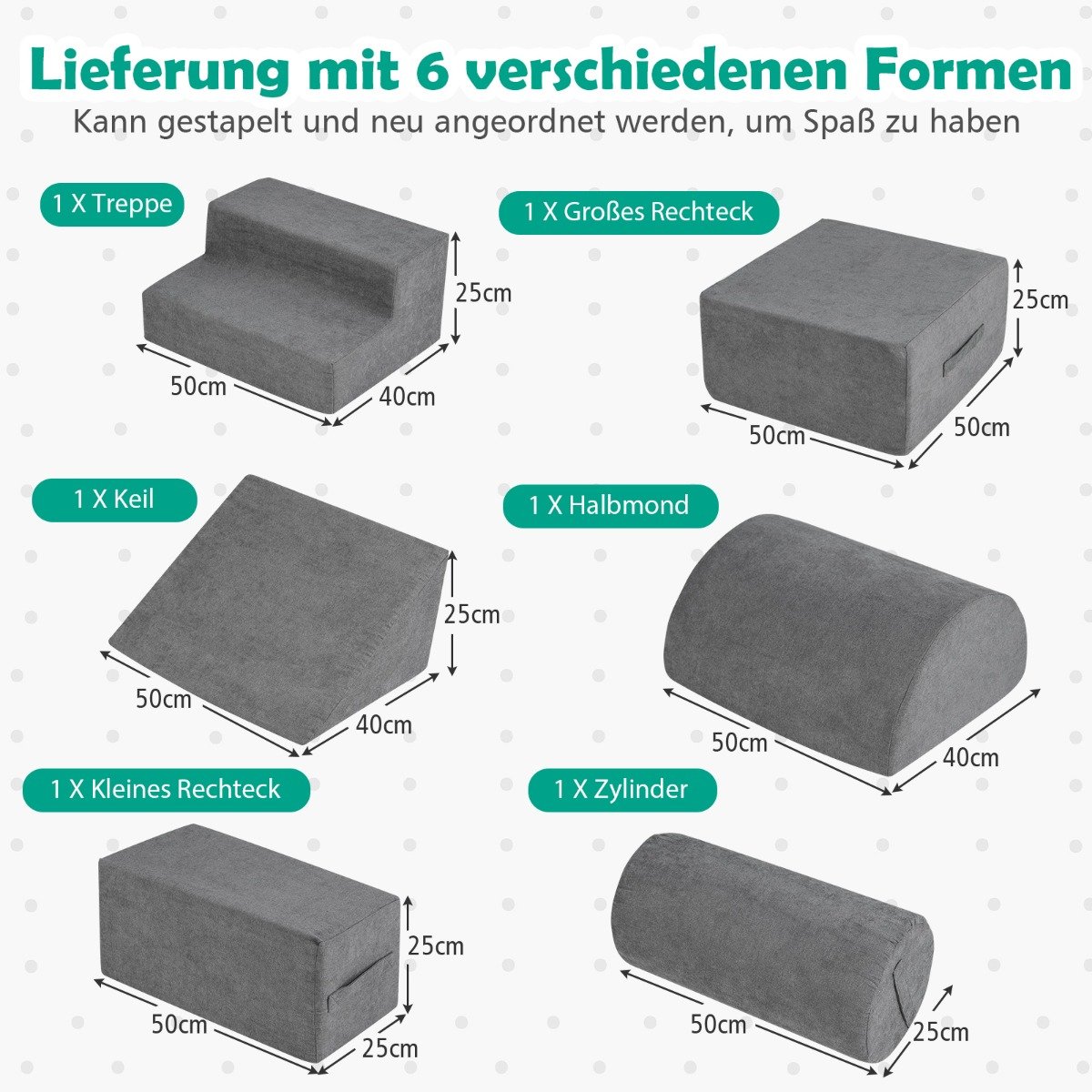 - Αρθρωτό Σετ Παιχνιδιού 6 Τεμαχίων: Αυτή η μαλακή δομή παιχνιδιού περιλαμβάνει 6 διαφορετικά σχήματα, όπως ένα σκαλοπάτι, ένα μεγάλο ορθογώνιο, ένα μικρό ορθογώνιο, ένα σχήμα σφήνας, ένα ημισέληνο και έναν κύλινδρο, που μπορούν να στοιβάζονται και να αναδιαμορφώνονται για διασκεδαστικό παιχνίδι. Τα παιδιά μπορούν να ανακαλύψουν πολλές δημιουργικές επιλογές για να τα διατάξουν.