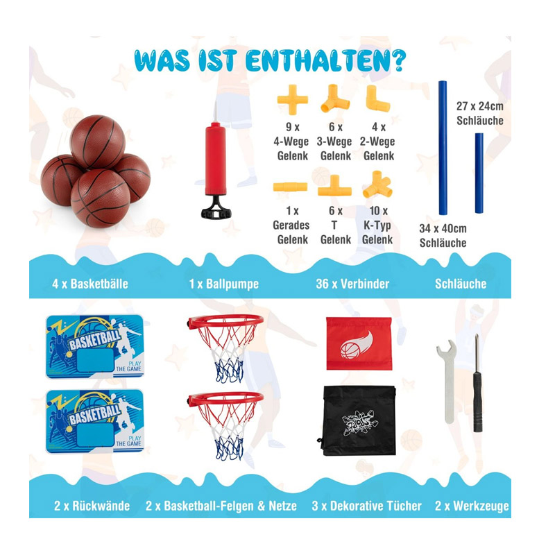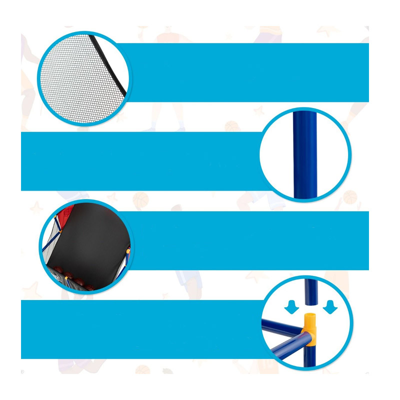 Με 2 στιβαρά και αδιάσπαστα ταμπλό, 2 στεφάνες με ανθεκτικά δίχτυα, προστατευτικό δίχτυ υψηλής πυκνότητας και στις δύο πλευρές και ανθεκτική στο σκίσιμο ράμπα επιστροφής μπάλας από ύφασμα Oxford. Τα παιδιά μπορούν να αποθηκεύουν μπάλες και άλλα παιχνίδια κάτω από τη βάση όταν δεν παίζουν.