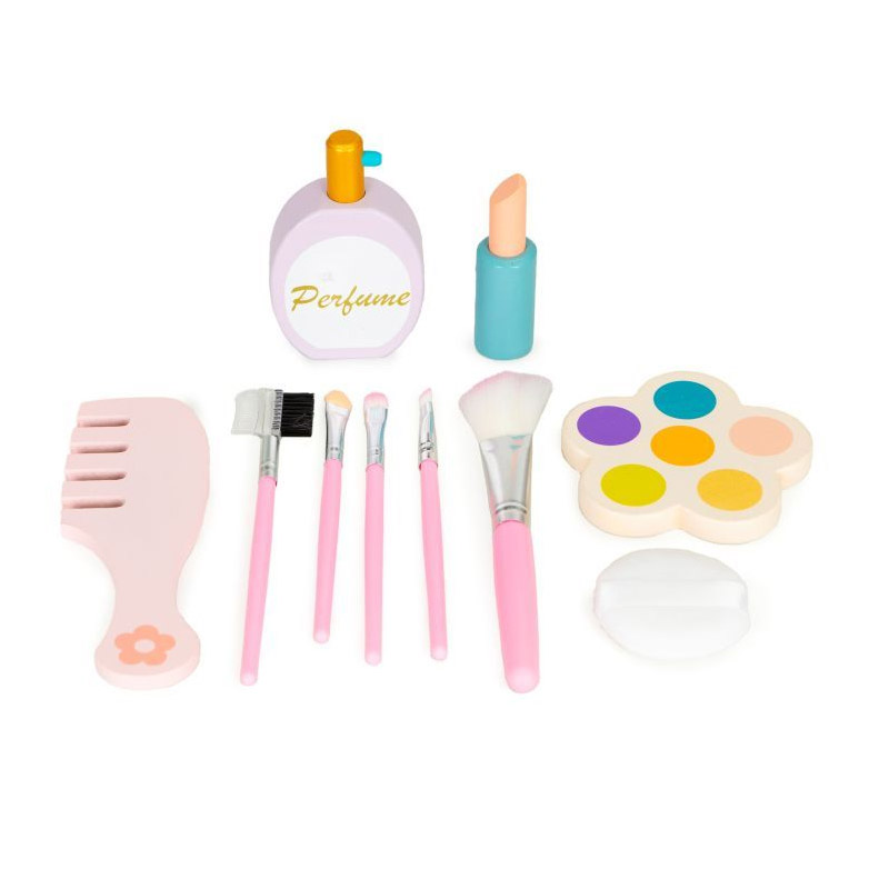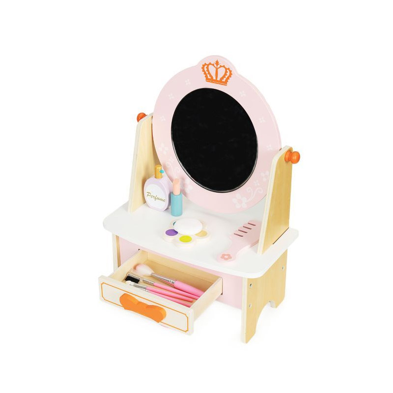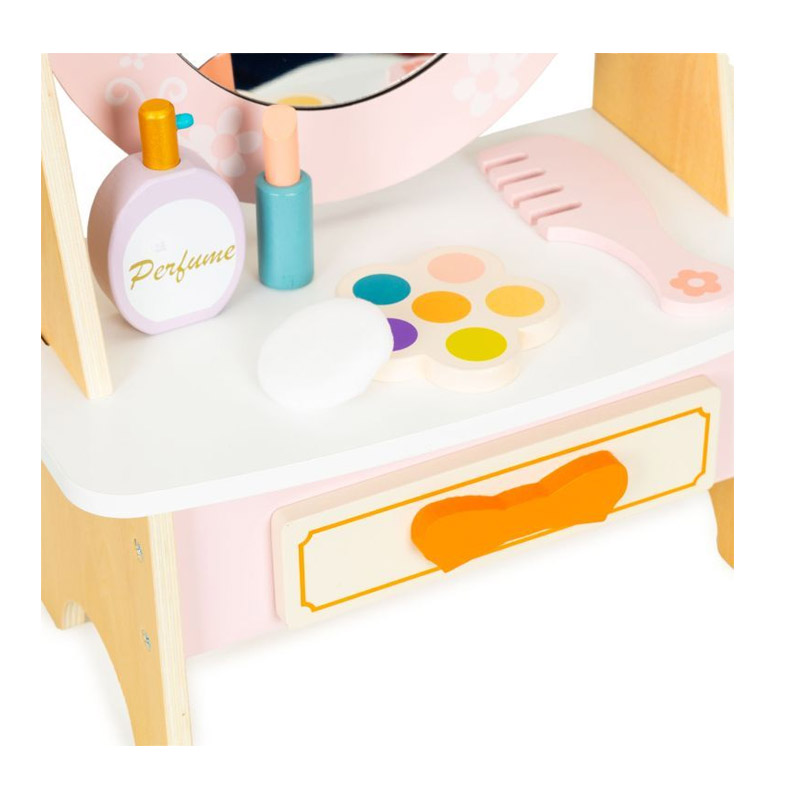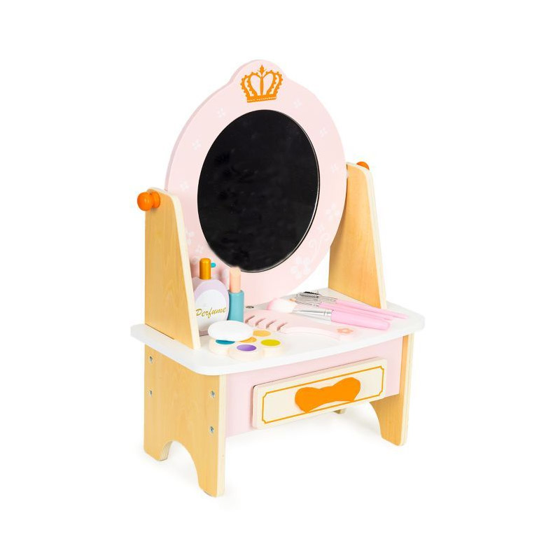 Παιδική τουαλέτα ομορφιάς, από την εταιρεία Ecotoys, με διάφορα αξεσουάρ, με τα οποία το παιδί μπορεί να μιμηθεί την πραγματικότητα μέσα από ένα παιχνίδι ρόλων. Το κύριο στοιχείο της τουαλέτας ομορφιάς είναι η συμπαγής ξύλινη κατασκευή, η οποία συνδυάζει ανθεκτικότητα και λεπτότητα. Οι στυλιζαρισμένες, στρογγυλεμένες άκρες δίνουν έναν ασφαλή χαρακτήρα, ιδανικό για παιδιά. Ένα συρτάρι σας επιτρέπει να αποθηκεύετε μικρά αντικείμενα και τα ξύλινα αξεσουάρ προσθέτουν γοητεία και λειτουργικότητα. Προορίζεται για παιδιά άνω των 3 ετών και διαθέτει ασφαλή καθρέφτη.